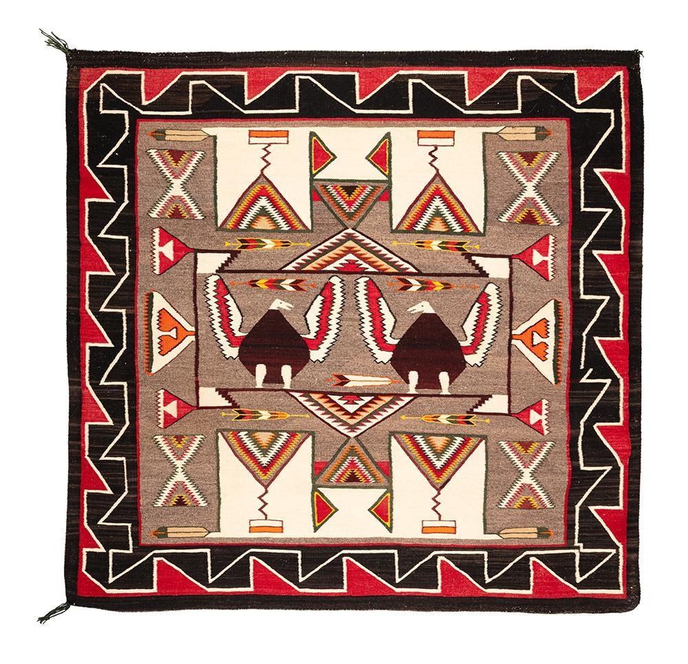 6'7" x 6'9" Red Mesa outline pictorial weaving featuring two pleasantly plump bald eagles facing each other. The birds are framed by a fine line rectangular box, which is surrounded by great Red Mesa and Teec Nos Pos elements. A meandering red and black border frames the piece nicely. This square weaving displays great on a wall. Woven with all Native hand-carded, handspun and hand-dyed Churro cross sheep wools on a wool warp. Circa 1930.