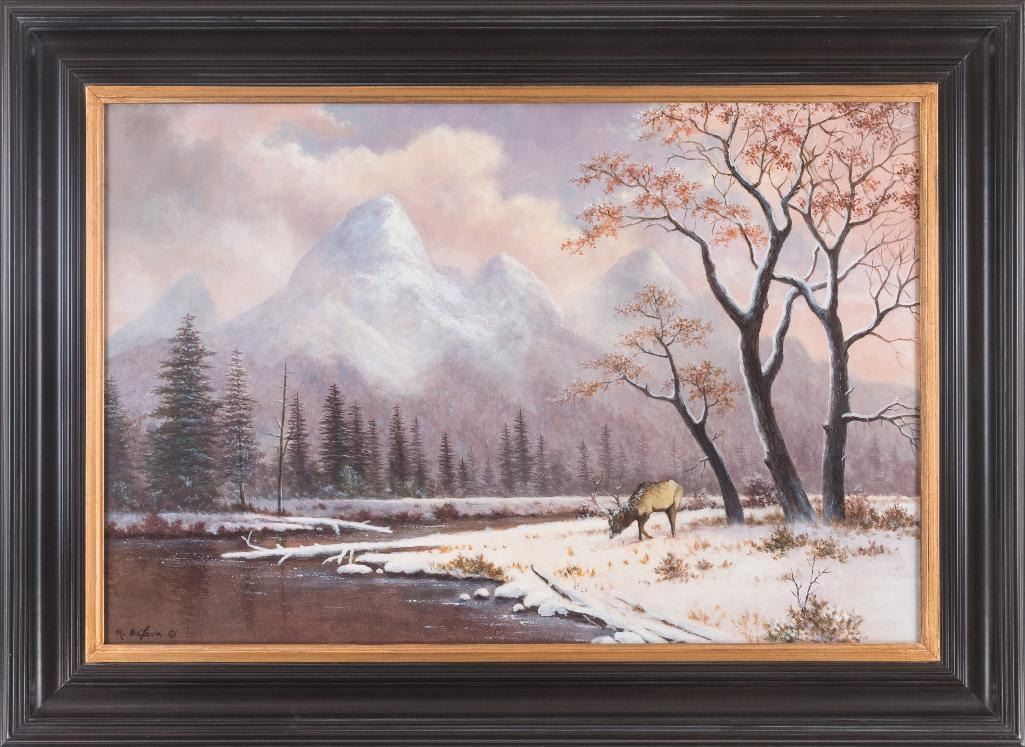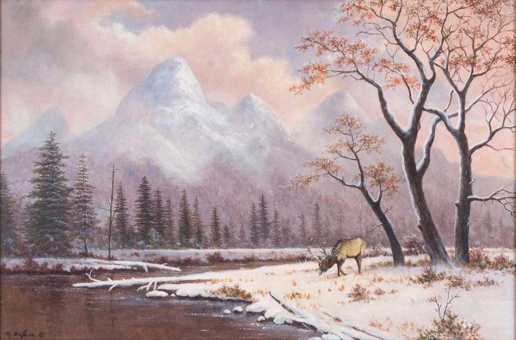 Robert De Leon (1953 - ) Winter in the Tetons 24" x 36" oil on canvas Signed lower left Verso: Titled, signed and dated 2016/2017. $2,000-3,000