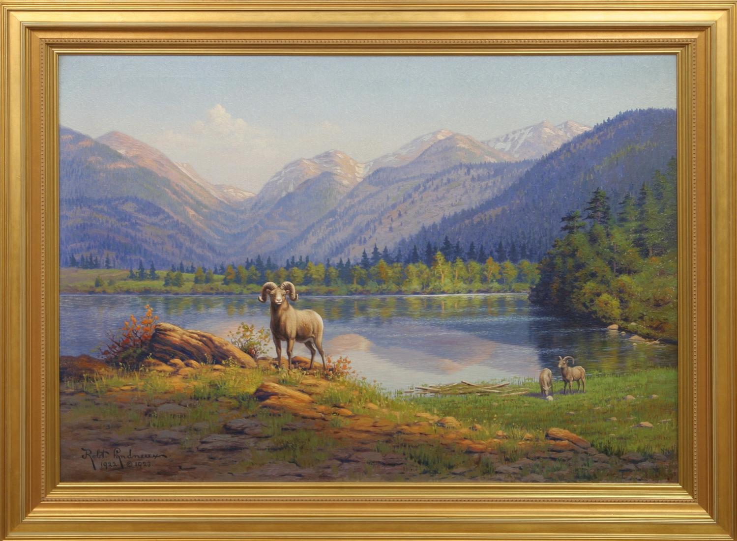 Robert Lindneux (1871-1970). Sheep Lake, Rocky Mountain National Park. 30" x 42" oil on canvas. signed and dated 1922 lower left. (est $4,000-6,000) Condition Report: Black lights clean