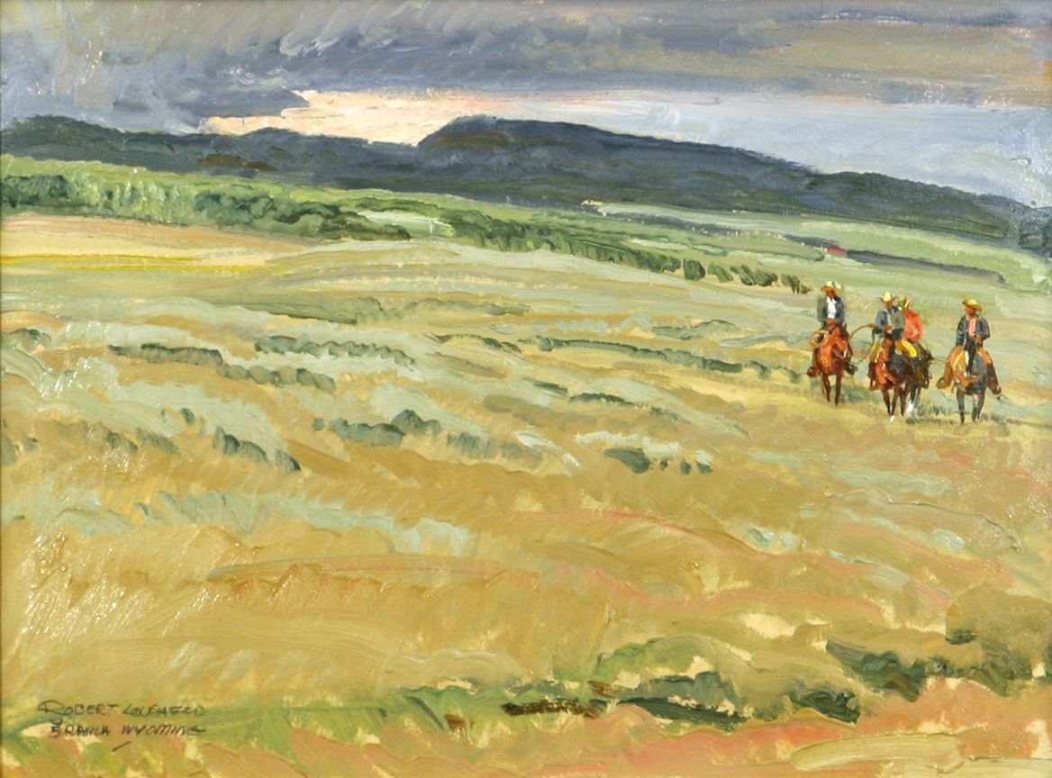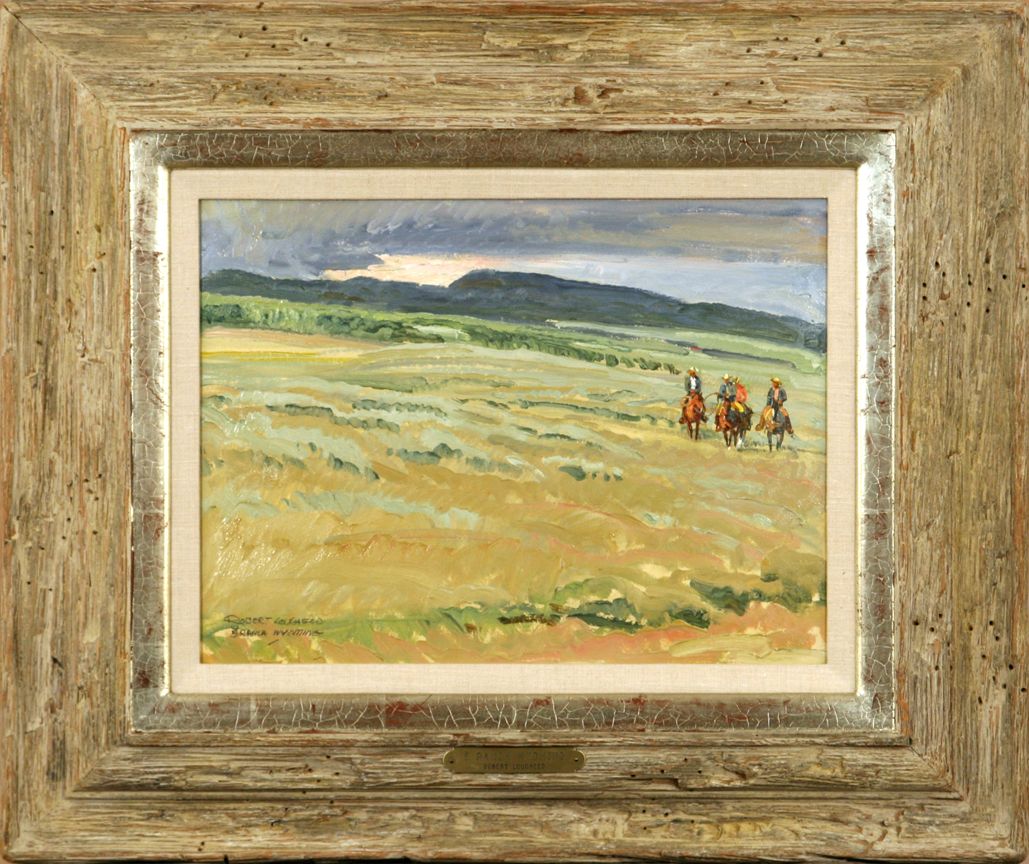 Robert Lougheed (1910 - 1982). Quarter Circle 5 Ranch, Wyoming. Jack Swanson, Fred Fellows & Joe Beeler, landscape painted on spot during 1973 CA Trail Ride. 12" x 16" oil on board. Signed lower left: ROBERT LOUGHEED, [quarter circle five] RANCH, WYOMING. Condition reports can be viewed at www.marchinmontana.com/docs/2013CR.pdf