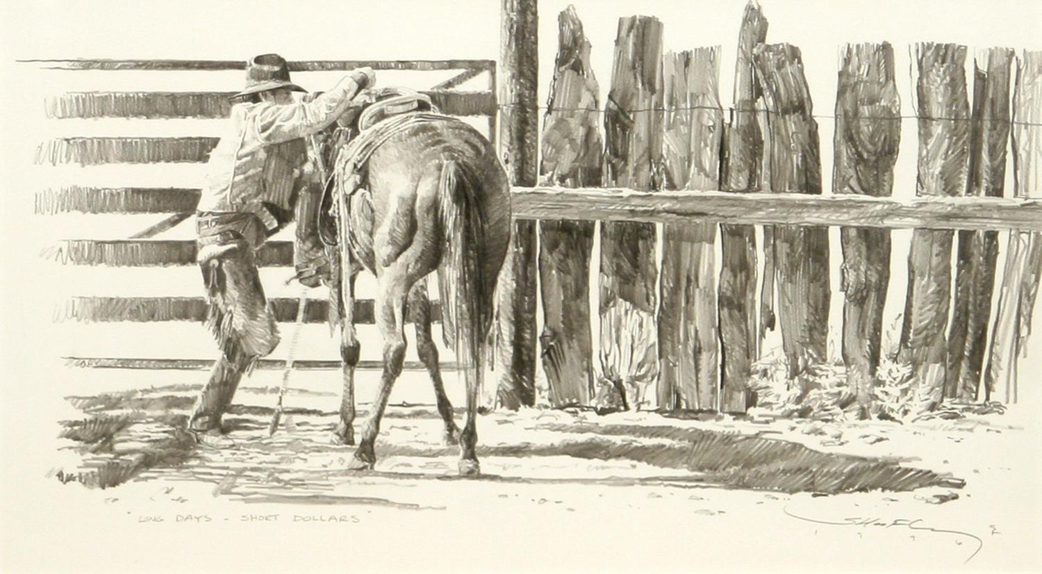 Robert "Shoofly" Shufelt (b. 1935). Long Days - Short Dollars. 11 ½" x 20 ¾" pencil drawing. signed lower right. (est $3,000-4,000) Condition Report: Fine condition