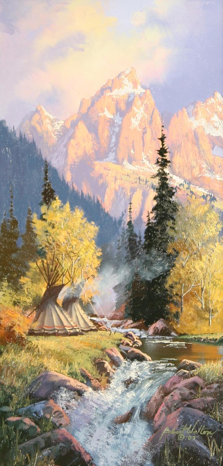 Robert Walton (20th century). Summer Lodges. 24" x 12" oil on canvas. signed lower right. (est $1,000-2,000) Condition Report: Black lights clean