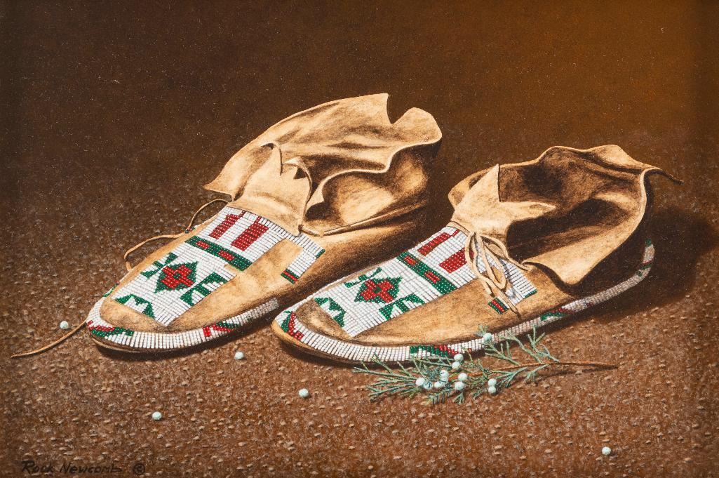 Rock Newcomb (1945 - ) Leather Beads 9" x 12" acrylic on board Signed lower left Verso: Titled and signed. "This painting features a lovely pair of Cheyenne moccasins, circa 1900. The beading is done using the "lazy stitch" method used almost exclusively by the Cheyenne, Sioux, Arapaho, and Pawnee. During the summer, men and boys wore low-cut, close-fitting moccasins with stiff rawhide soles and soft buckskin uppers. The small branch and berries are Juniper. Native people ate the berries fresh or in cakes and used the bark in many utilitarian ways." $1,500-2,500 Provenance: Joe Doris Hinton Collection, Washington, TX.