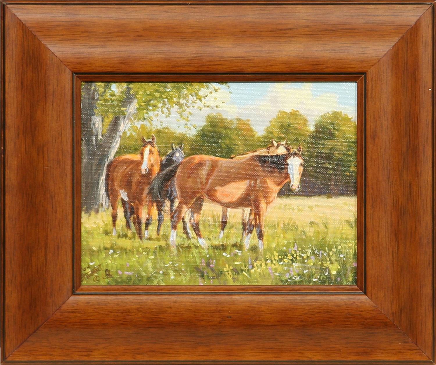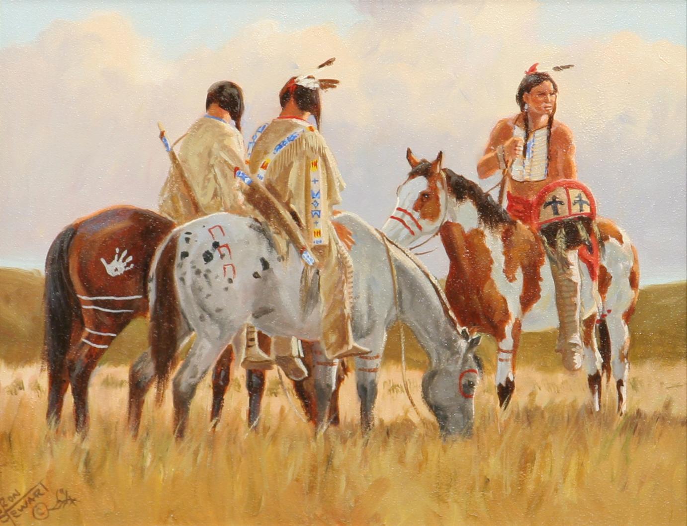 Ron Stewart (b. 1941). Two oils on board. (1) Pasture Budds. 6" x 8". (2) Lakota Braves. 8" x 10". each signed lower left. (est $800-1,200) Condition Report: Both black light clean