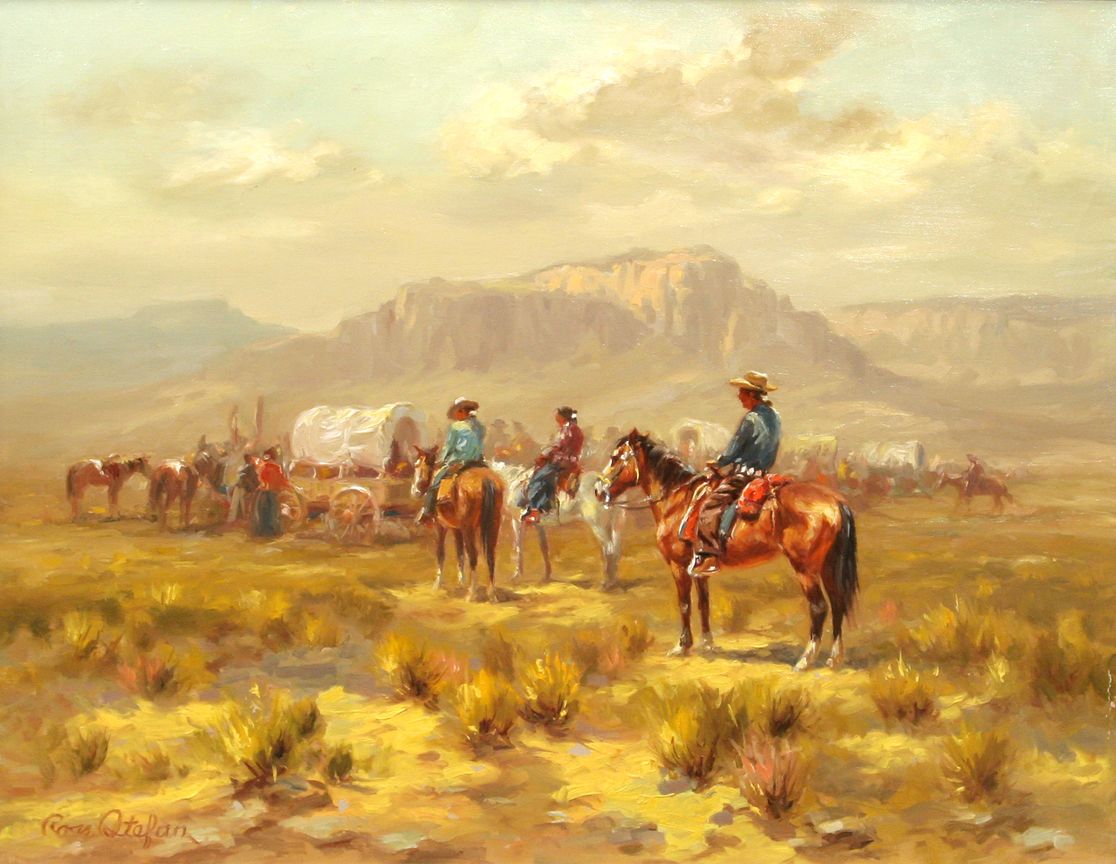 Ross Stefan (1934 - 1999). Crossroads In The Southwest. 24" x 30" oil on canvas. Signed lower left: Ross Stefan. Condition reports can be viewed at www.marchinmontana.com/docs/2013CR.pdf