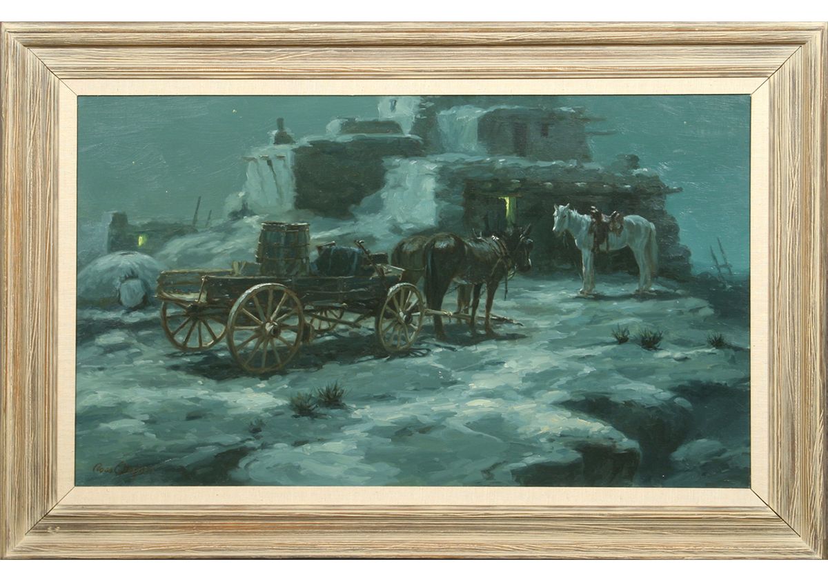 Ross Stefan (1934 - 1999). The Listeners. 24" x 40" oil on canvas. Signed lower left: Ross Stefan. Condition reports can be viewed at www.marchinmontana.com/docs/2013CR.pdf