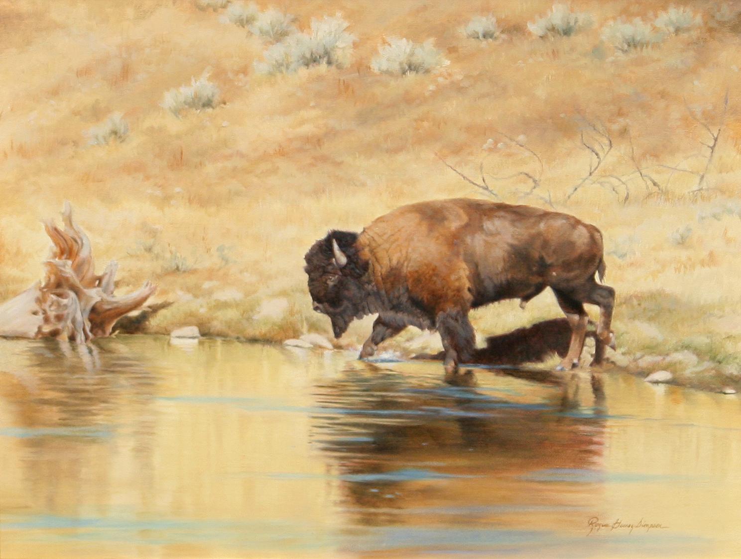 Rouge Guirey Simpson (1943-2005). Buffalo In A Stream. 18" x 20" oil on board. signed lower right. (est $2,000-3,000). Provenance: National Museum of Wildlife Art, Jackson, WY. Condition Report: Black lights clean. In fine distressed wood frame