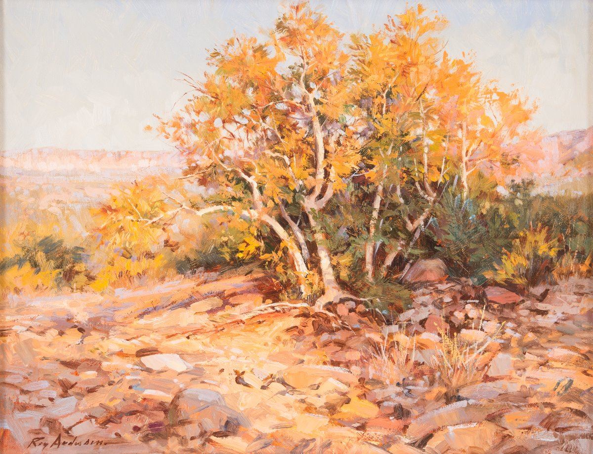 Roy Andersen (1930 - )(CA). Dry Beaver Sycamore. 14" x 18" oil on canvas. Signed lower left.