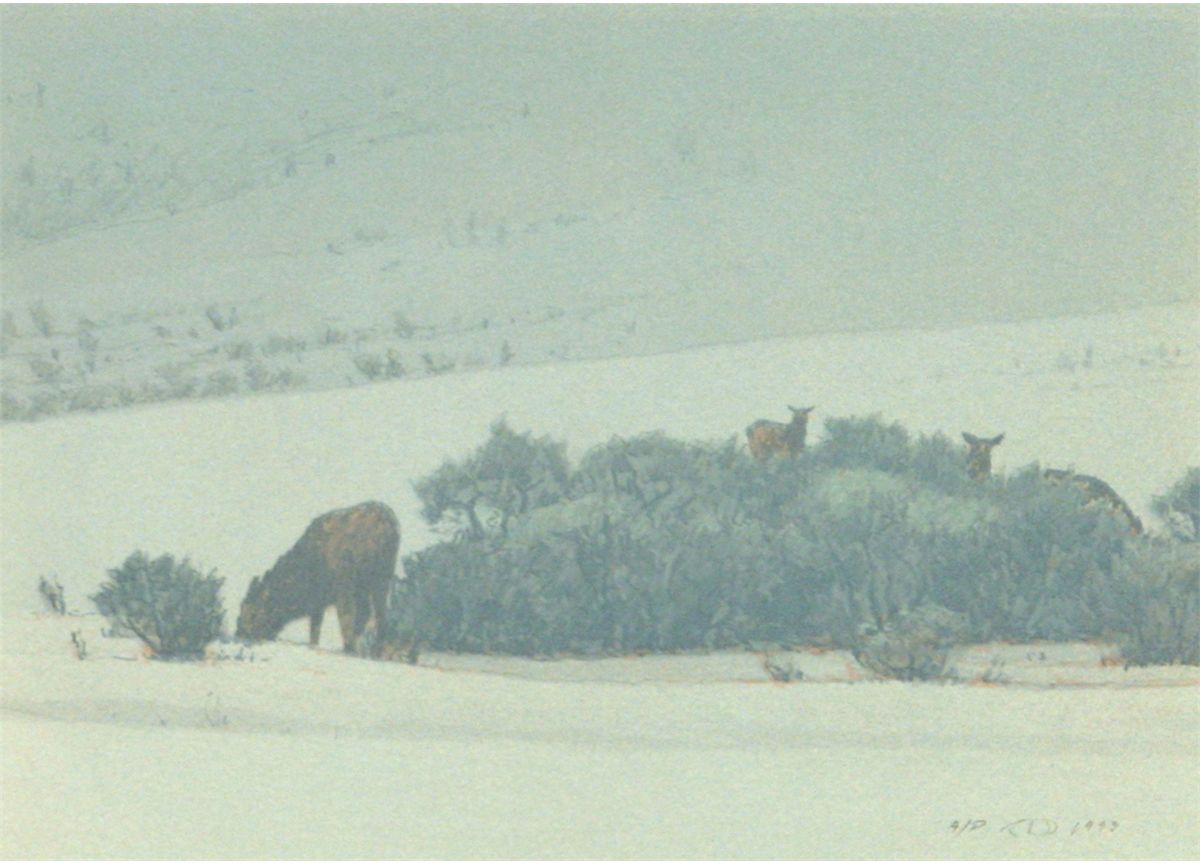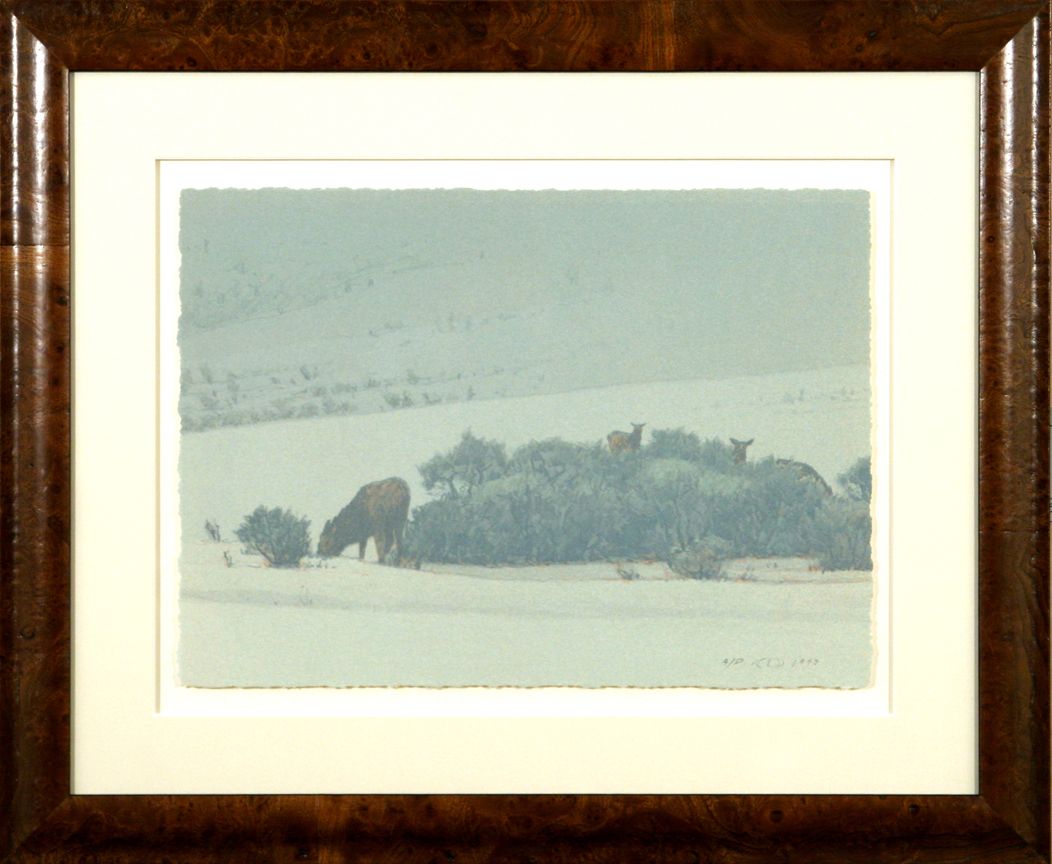 Russell Chatham (1939 - ). Elk On A Winter Evening. 10.75" x 14.875" lithograph. Pencil signed lower right: A/P [artist's cypher] 1993. Condition reports can be viewed at www.marchinmontana.com/docs/2013CR.pdf