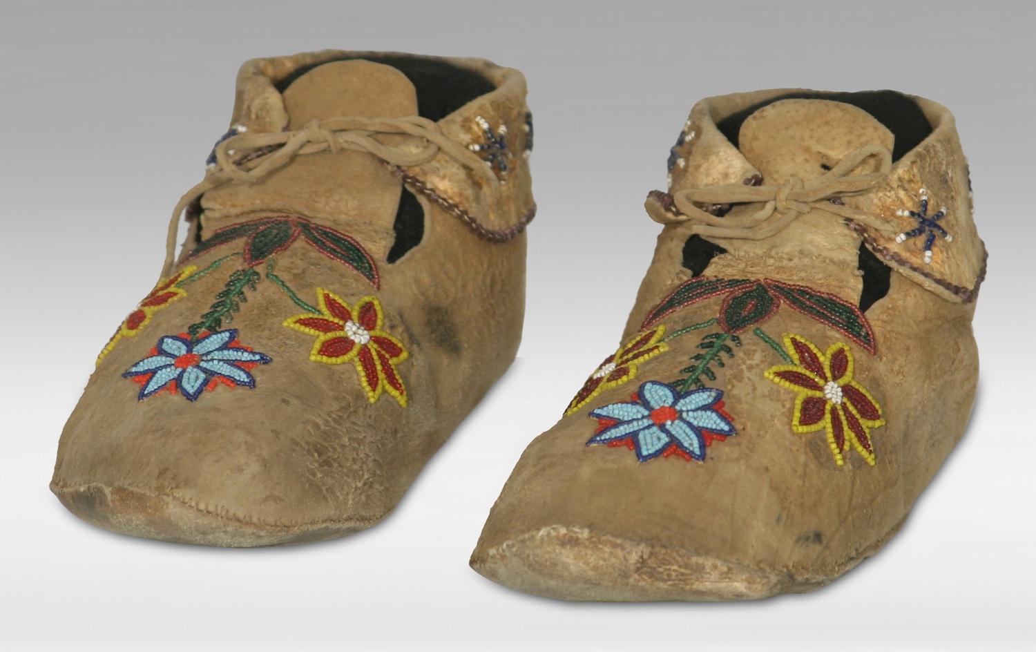 Santee Sioux Moccasins. Partially Beaded. 9" long. circa 1900. (est $500-1,000) Condition Report: Hide discolored from age and use. Visible seam repairs. Beadwork generally intact with slight damage to beaded edge