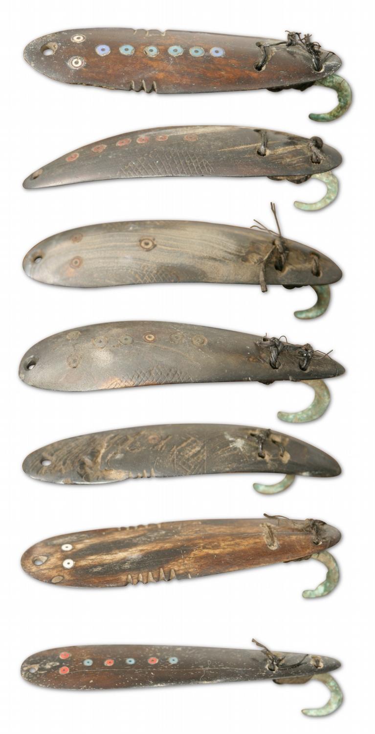 Seven Northwest Coast Lures. Cut glass eyes & hand forged copper hooks, nice collection. Each 5" long. 19th century. (est $1,200-1,600) Condition Report: All darkened from age and use, but all sound
