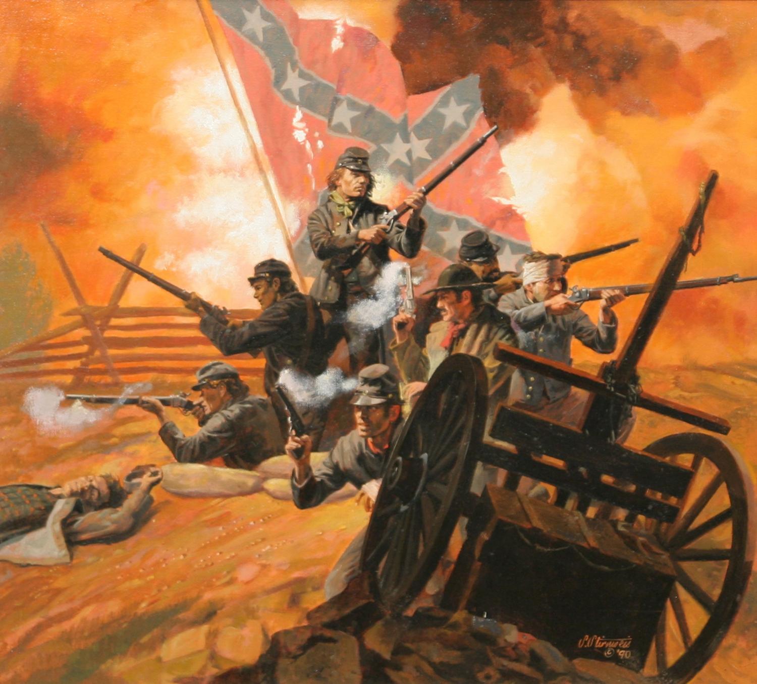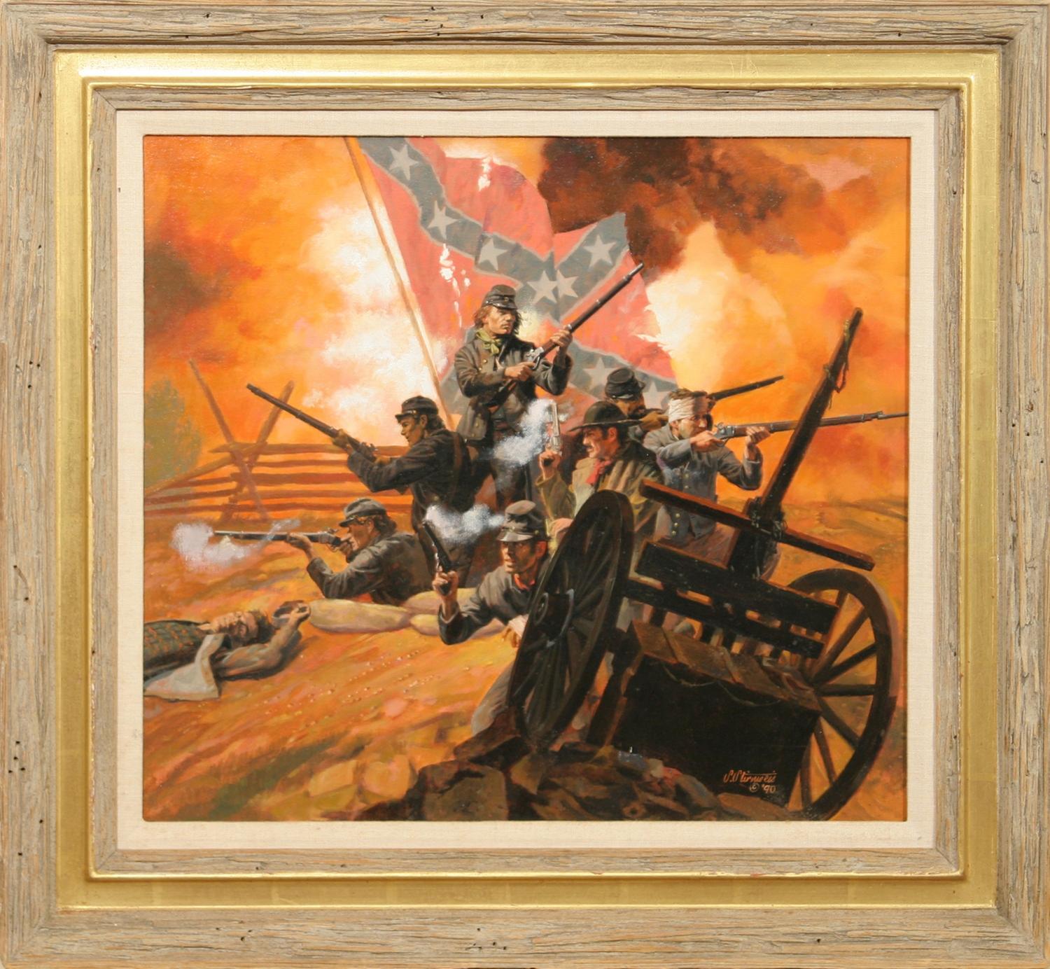 Shannon Stirnweis (b. 1931). Last Stand At Shiloh. 19" x 21" oil on board. signed lower right. (est $1,500-2,500) Condition Report: Black lights clean
