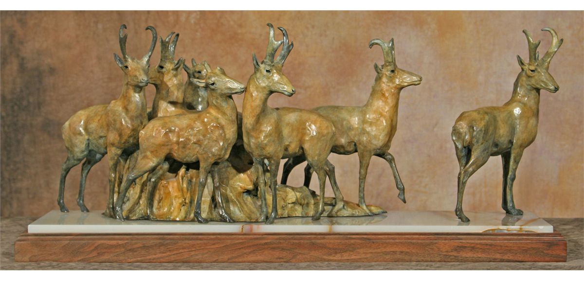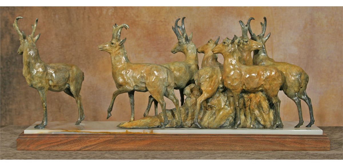 Sherry Sander (1941 - ). Antelope At Ingomar. 13" x 31" x 7.5" bronze on marble & wood base. Inscribed: S SANDER © 89 18/35. Internet, absentee & telephone/absentee & phone bidders please be advised that this sculpture weighs 85 lbs. Please call our shipper for an estimate prior to bidding - The Box Shop of Cheyenne (307) 634-0221. Condition reports can be viewed at www.marchinmontana.com/docs/2013CR.pdf