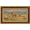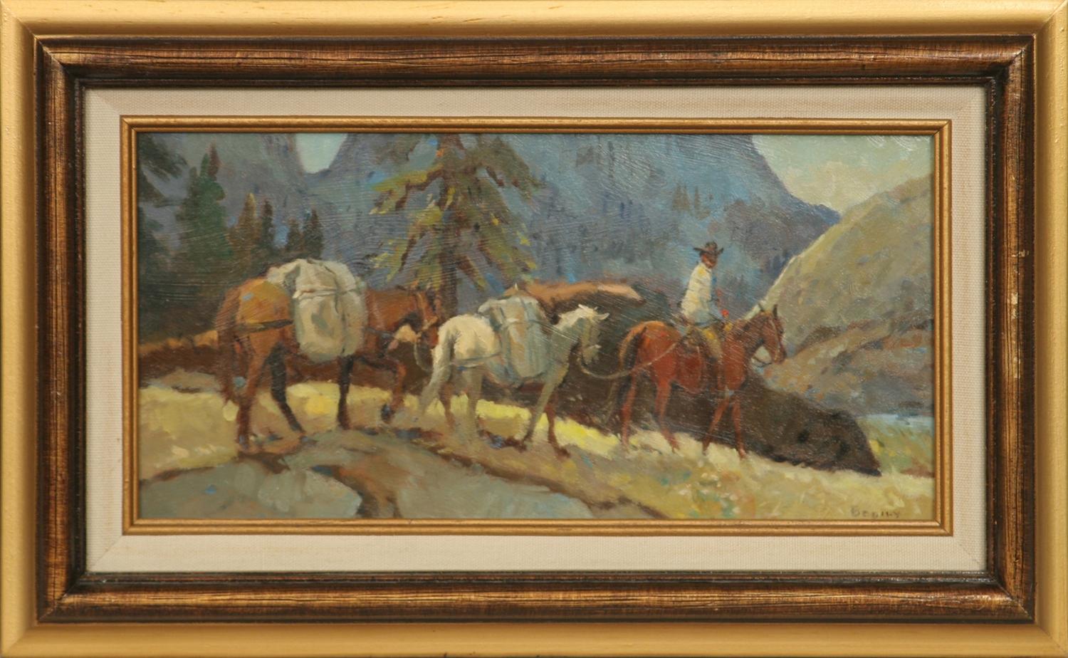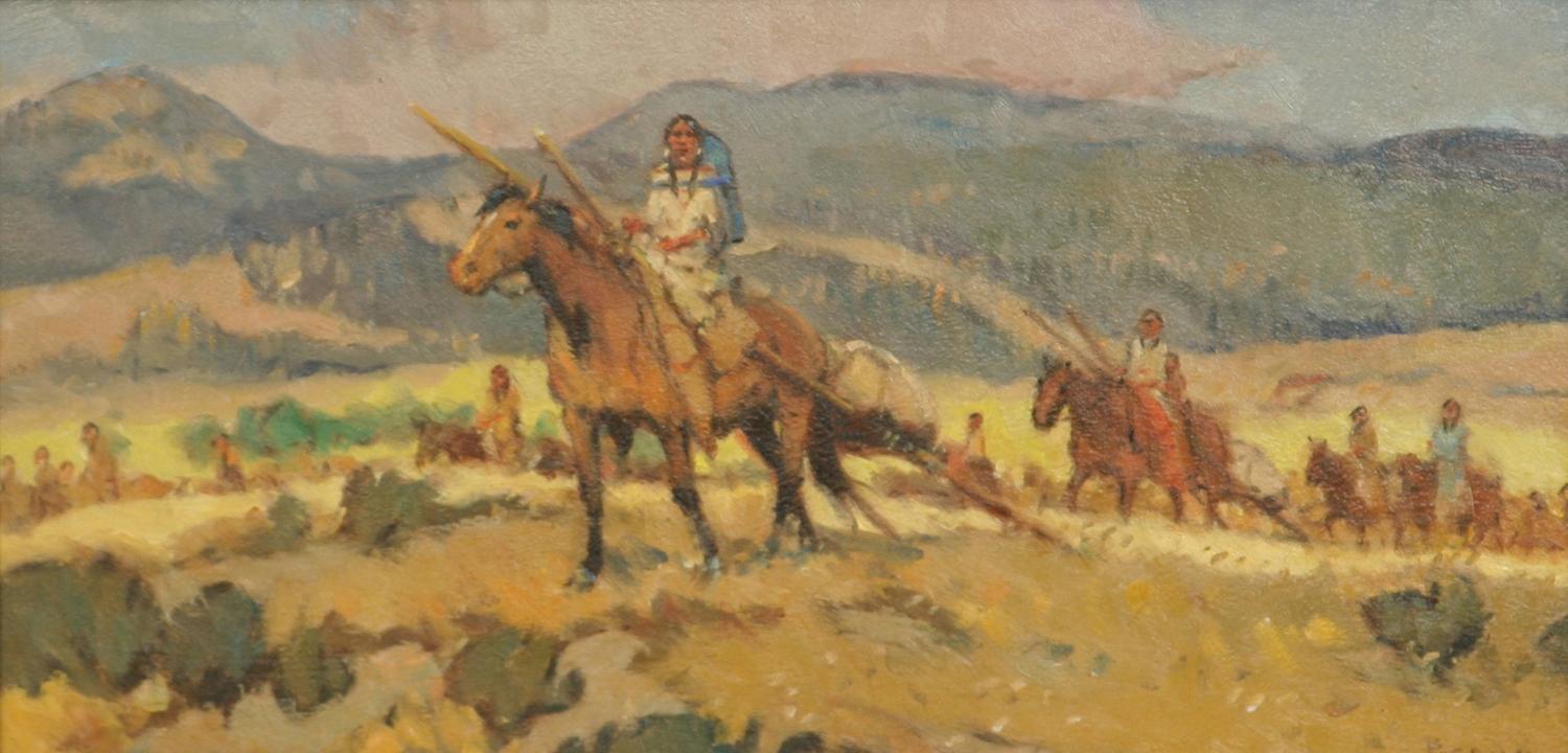 Sheryl Bodily (b. 1936). Two Oil Paintings. Each 6" x 12". Each signed lower right. . (1) Pack Train. (2) Moving Camp. (est $500-1,000) Condition Report: Both black light clean