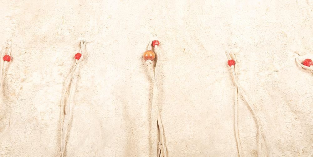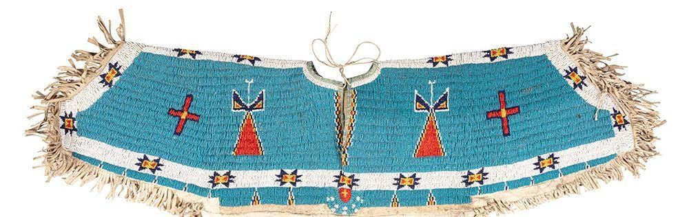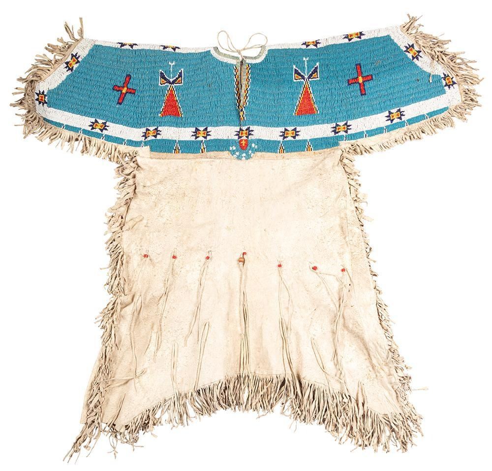 34" long x 36" wide with a fully beaded yoke with geometric beaded designs of crosses, modified valero stars and figures wearing dresses. Accented with large red trade beads and fringe drops. Early 20th century.