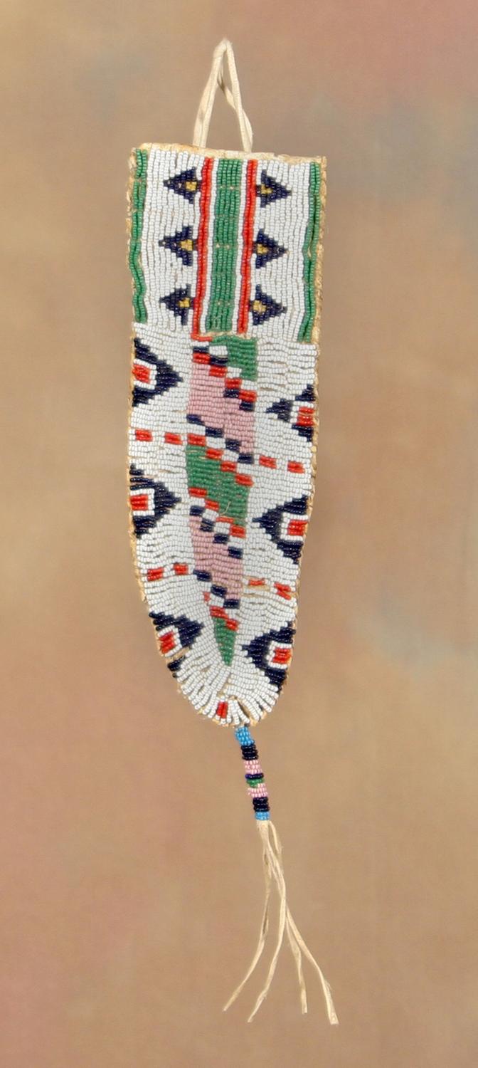 Sioux Beaded Knife Sheath. 15" long with drop, 3 ½" wide. Early 20th century. (est $1,000-2,000) Condition Report: Sheath in good condiition. Some bead loss, otherwise beadwork is excellent