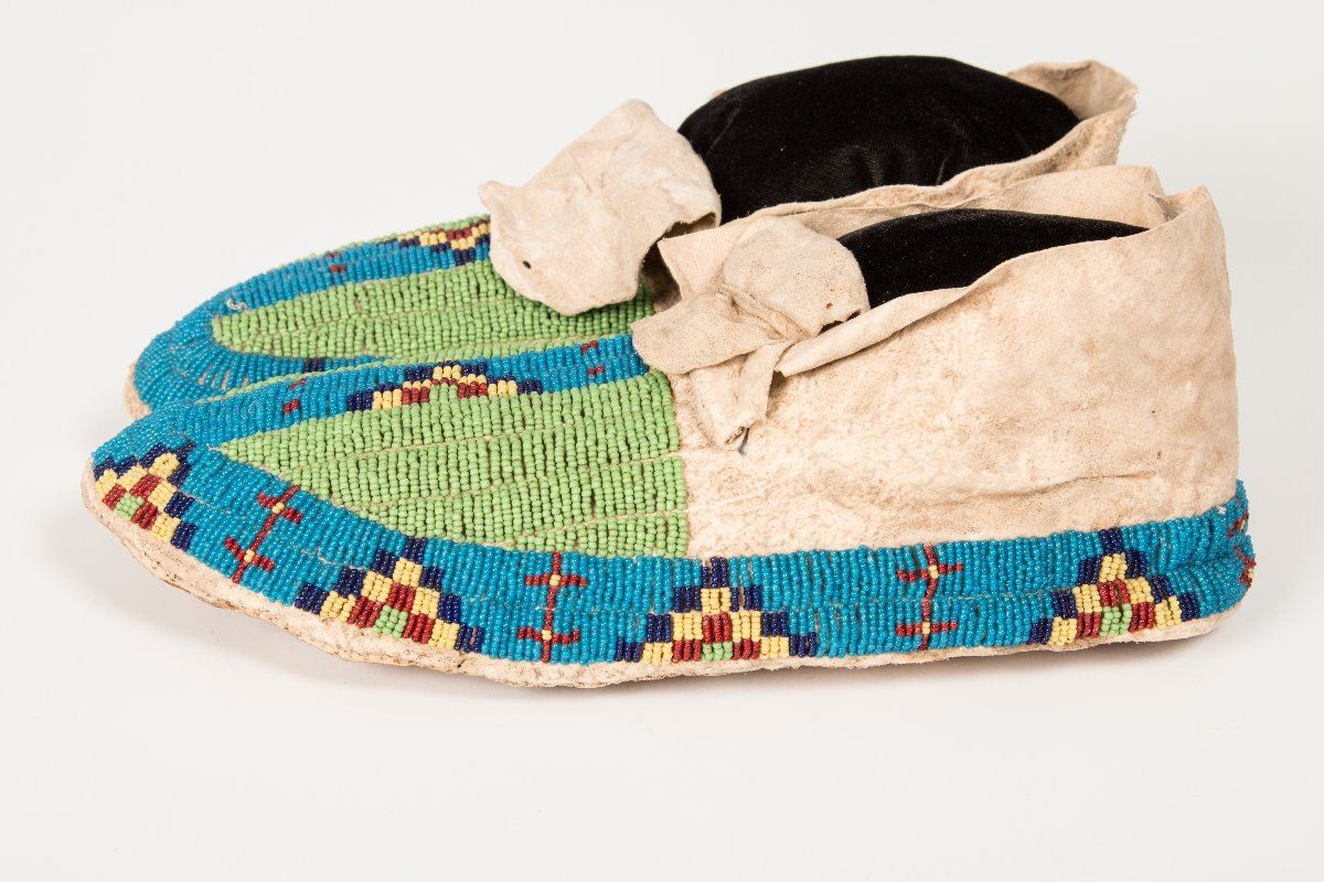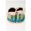 Sioux Beaded Man's Moccasins. 10 ¾" long. Fully beaded in blues, green, yellow and red and an unusual green and blue buffalo hoof design. Late 19th century.