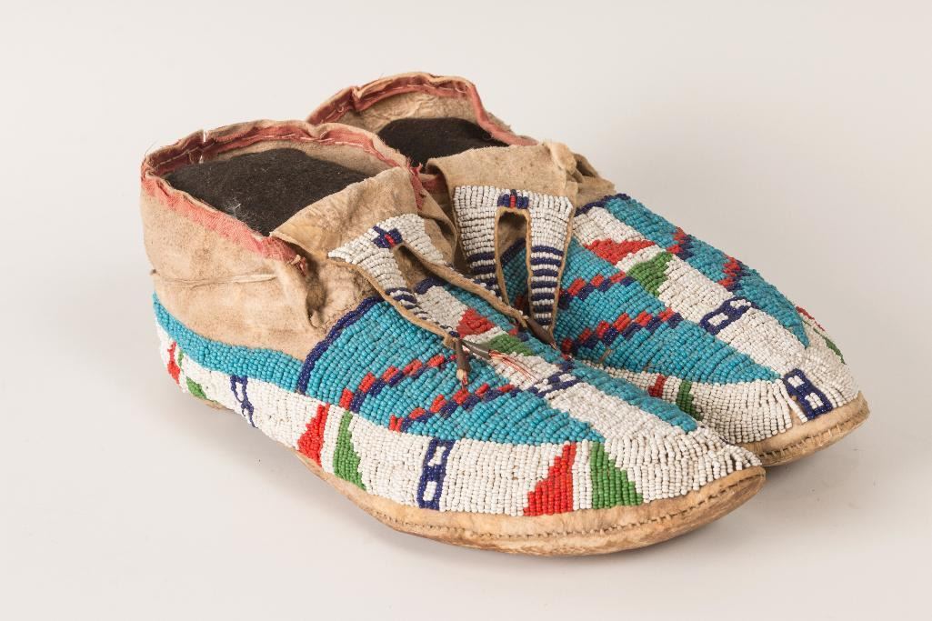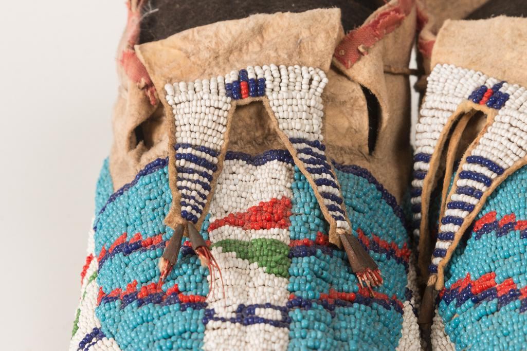 Sioux Beaded Man's Moccasins 11" long. Split beaded tongues accented with chicken feather-stuffed tin cones. Nicely beaded and trimmed with red trade cloth. Circa 1910. $700-900 Provenance: Ex Bokelman Collection.
