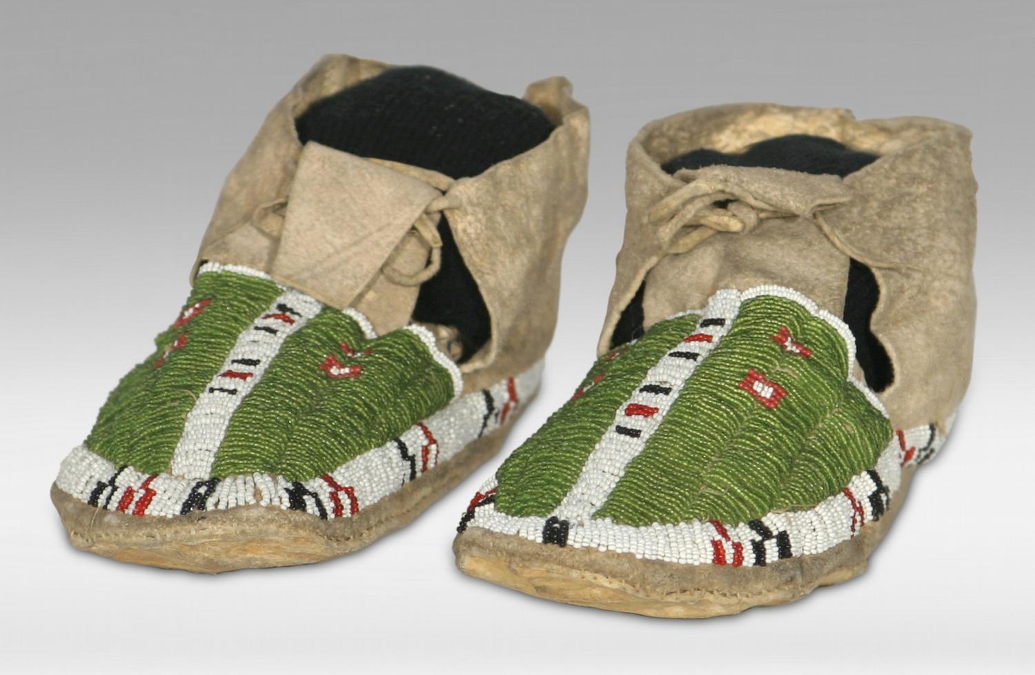 Sioux Beaded Moccasins. 10 ¼" long. Fully beaded on Indian tanned hide. 19th century. (est $1,200-1,600) Condition Report: Hide discolored from age and use. Beadwork is excellent