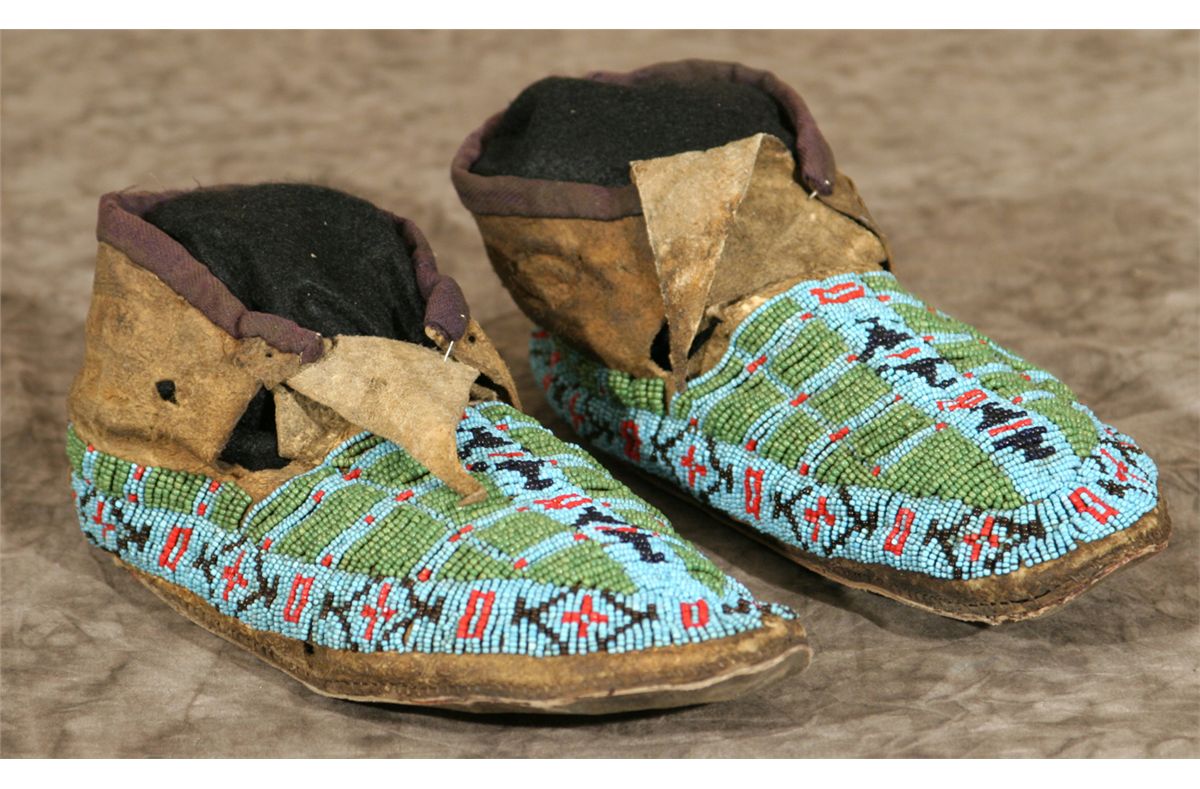 Sioux Moccasins. 10" long. Extensively beaded in classic colors & design elements. Edged in cloth. 19th century. Condition reports can be viewed at www.marchinmontana.com/docs/2013CR.pdf