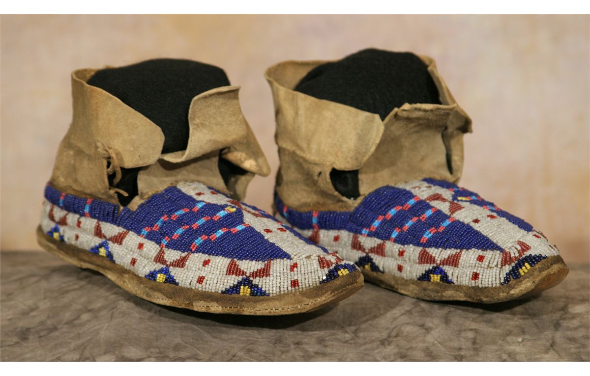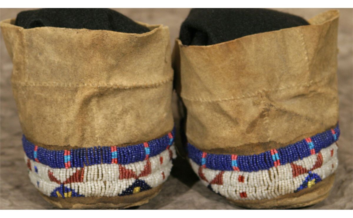 Sioux Moccasins. 10" long, fully beaded with teepee design elements. In colors of cobalt, translucent white, pale blue, green and yellow, with translucent red & white-heart-red. 19th century. Condition reports can be viewed at www.marchinmontana.com/docs/2013CR.pdf