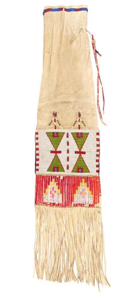 37" long x 9" at widest point. Geometrically beaded panel with different patterns on each side. Accented with horsehair stuffed tin cones and quilled drops. Early 20th century.