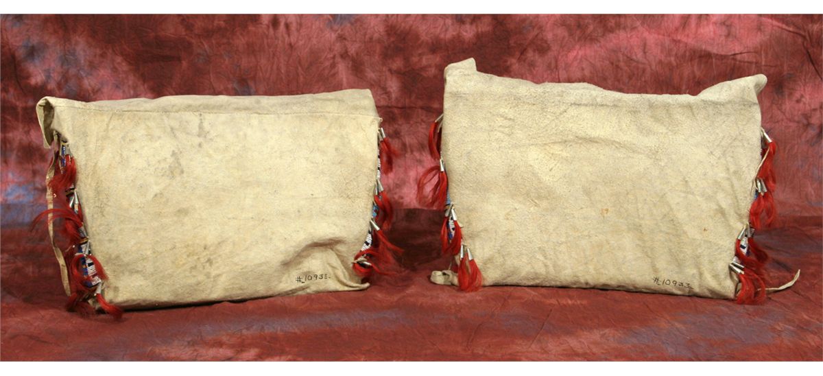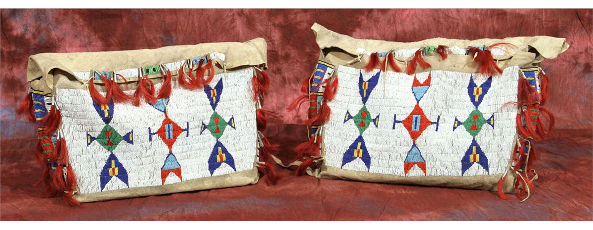 Pair Sioux Possible Bags. 13" x 20" each. Exceptional, fully beaded front panels on Indian tanned hide. Beaded in colors of green, yellow, two shades of blue & white-heart red on a white background. Decorated with lots of horsehair filled tin cones. 19th century. Provenance: Collection of Dr. Delwin & Karen Bokelman, PA., & pictured in their book Precious Dreams, page 48. Condition reports can be viewed at www.marchinmontana.com/docs/2013CR.pdf