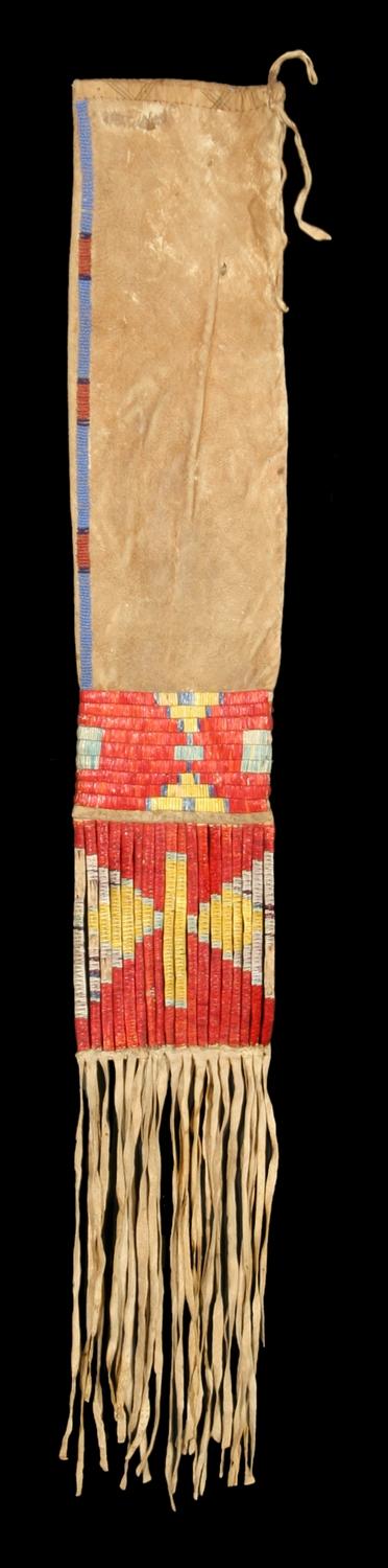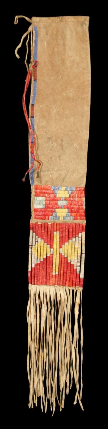 Sioux Quilled Pipebag. Beaded & quilled on both sides. 38" x 6". Bright colors. 19th century. (est $3,000-4,000) Condition Report: Some red ochre still visible. Fringe intact. Beadwork fine, quillwork shows minor loss