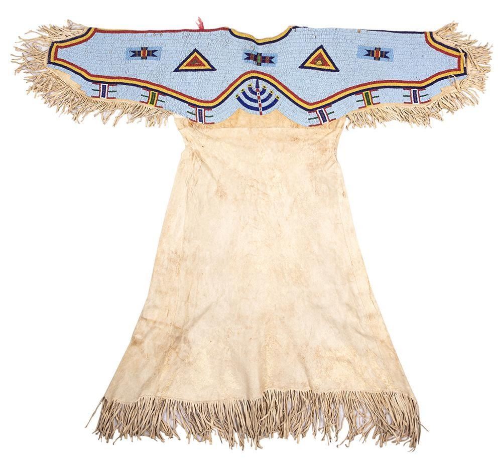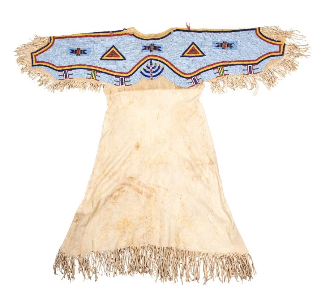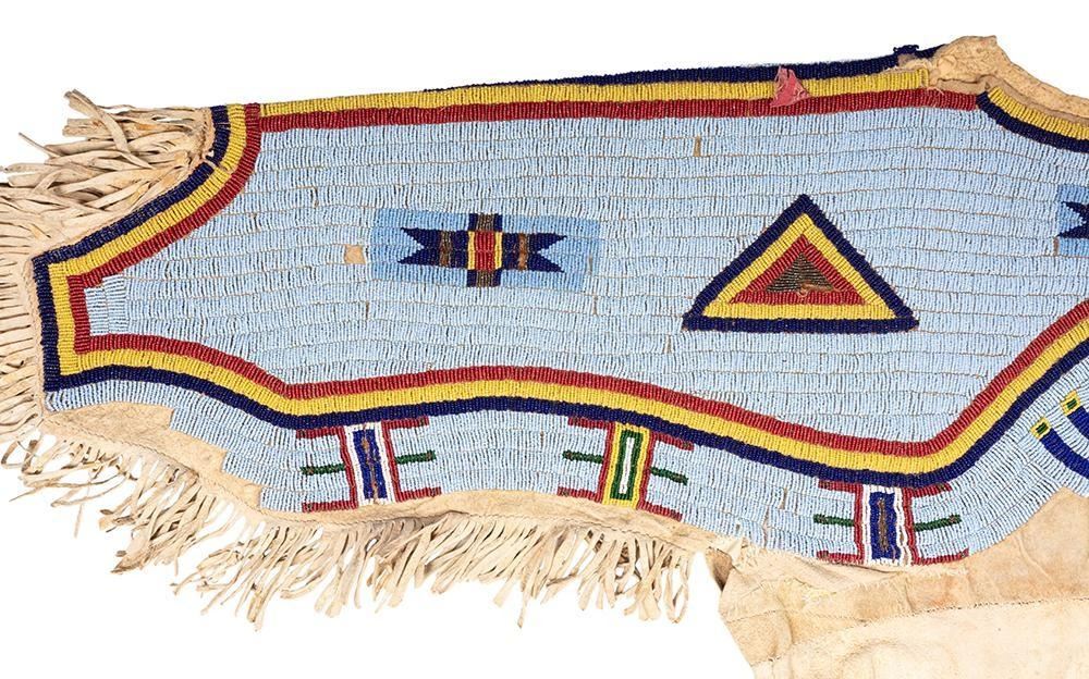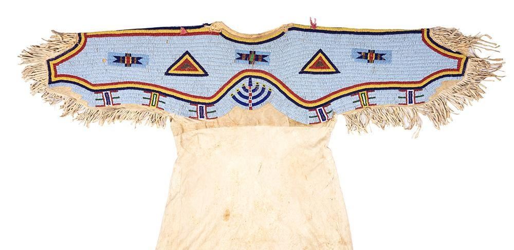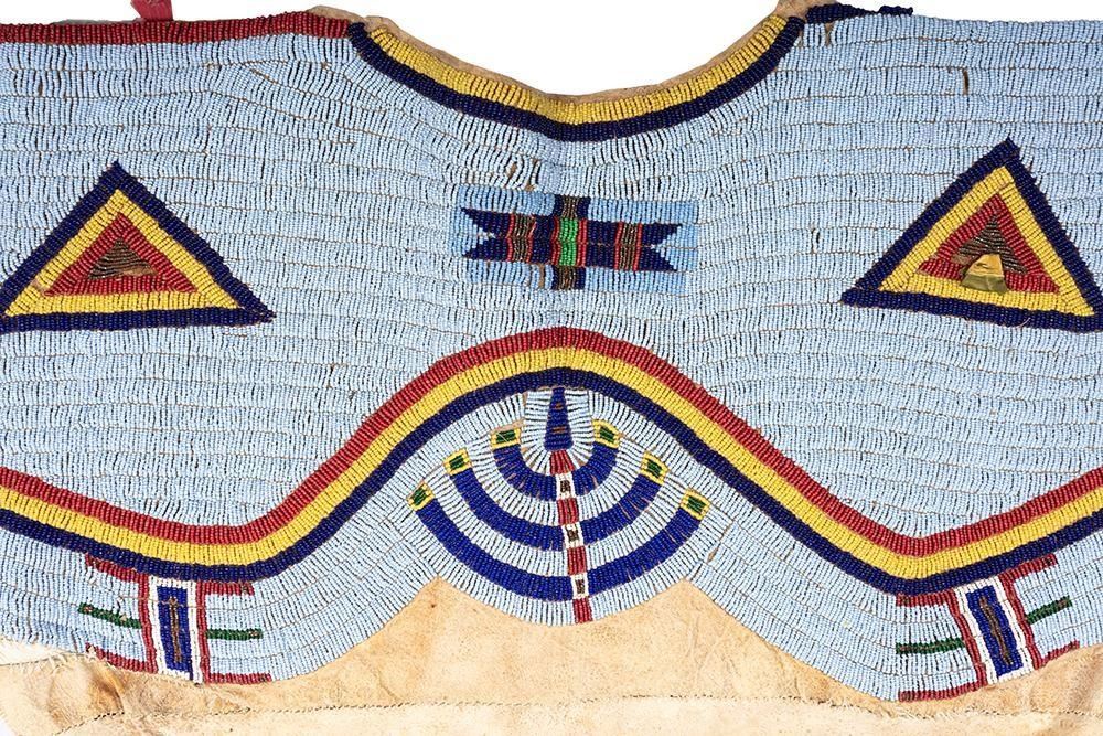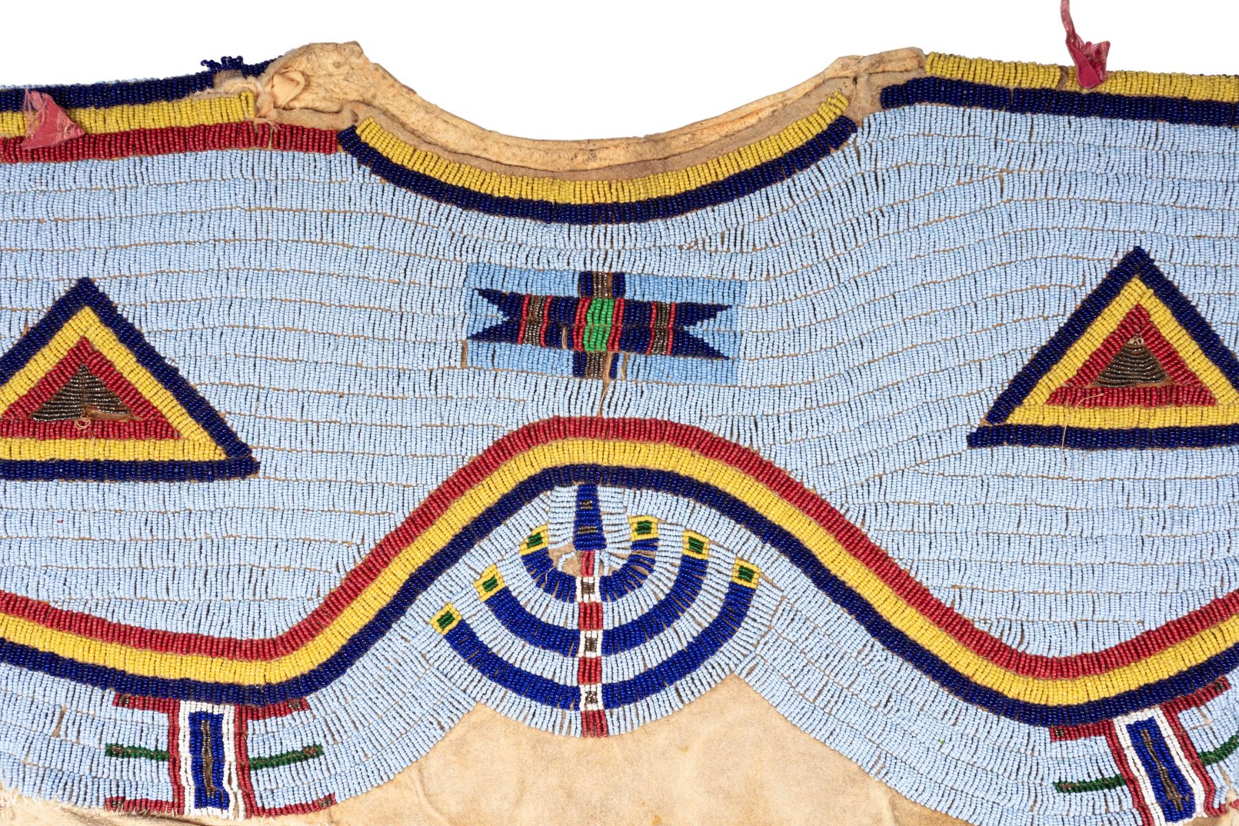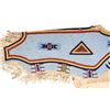 60" cuff to cuff x 52" long overall including fringe. Beautifully beaded with iron and brass beads in geometric patterns. Circa 1890.