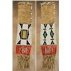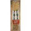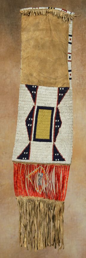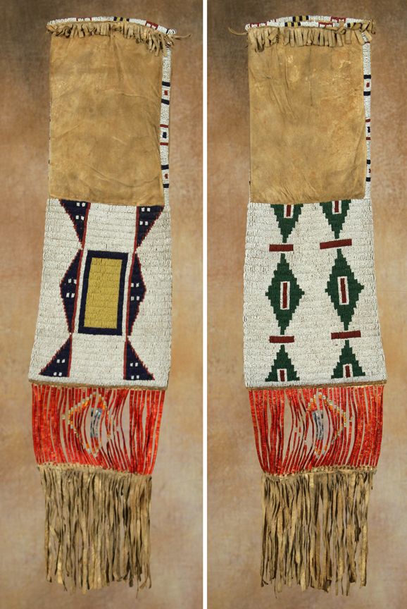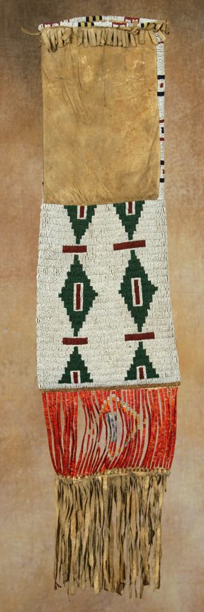 Sioux Pipebag. 21" x 8.5" with an additional 11" of dyed quill covered slats & hide fringe. Great geometric designs on panels, different on each side. Beaded in translucent green, cobalt, yellow & white-heart red on a white background. Beadwork continues up each side in single lanes & terminates around the throat. The throat is decorated with 1" fringe. 19th century. Condition reports can be viewed at www.marchinmontana.com/docs/2013CR.pdf