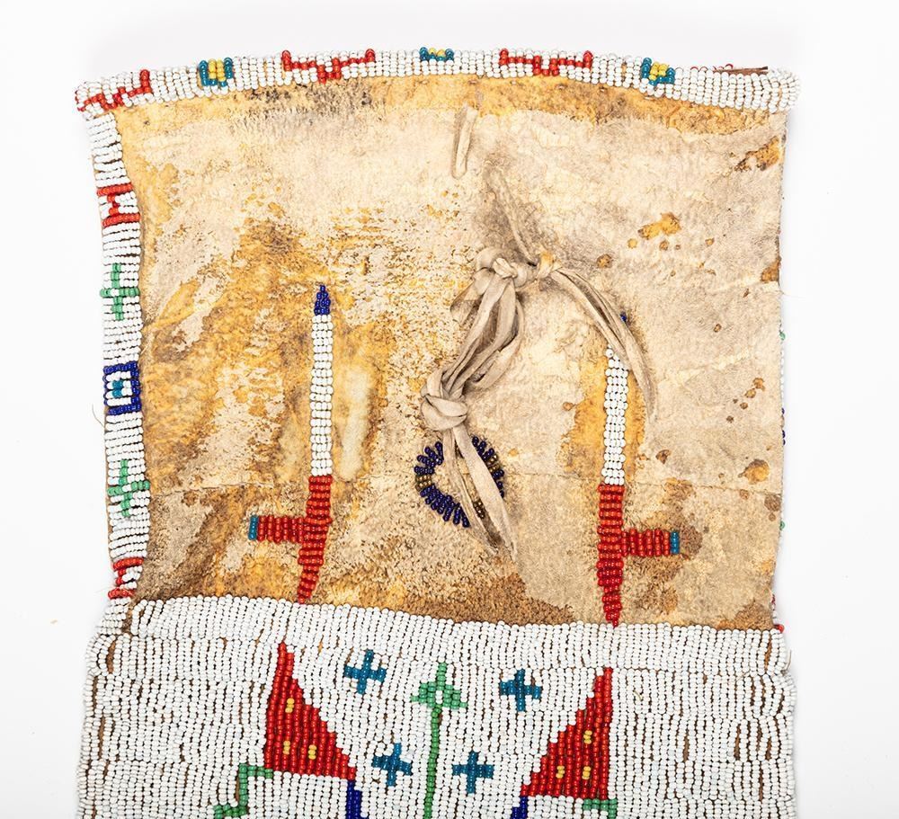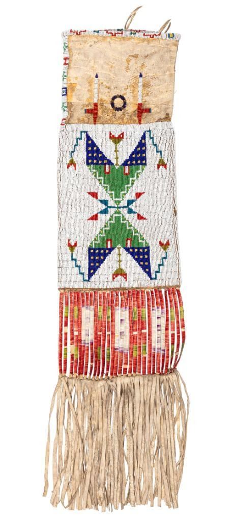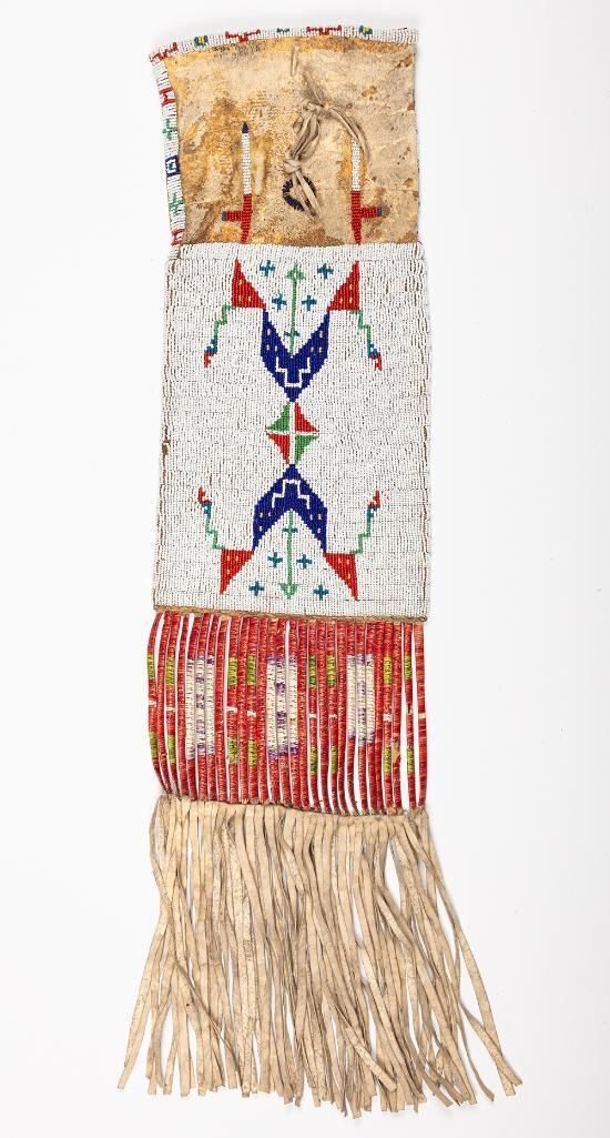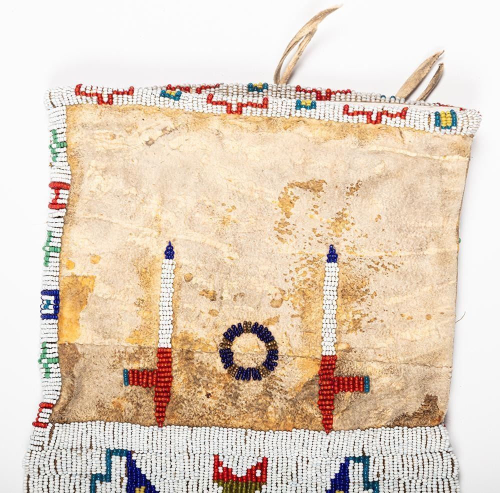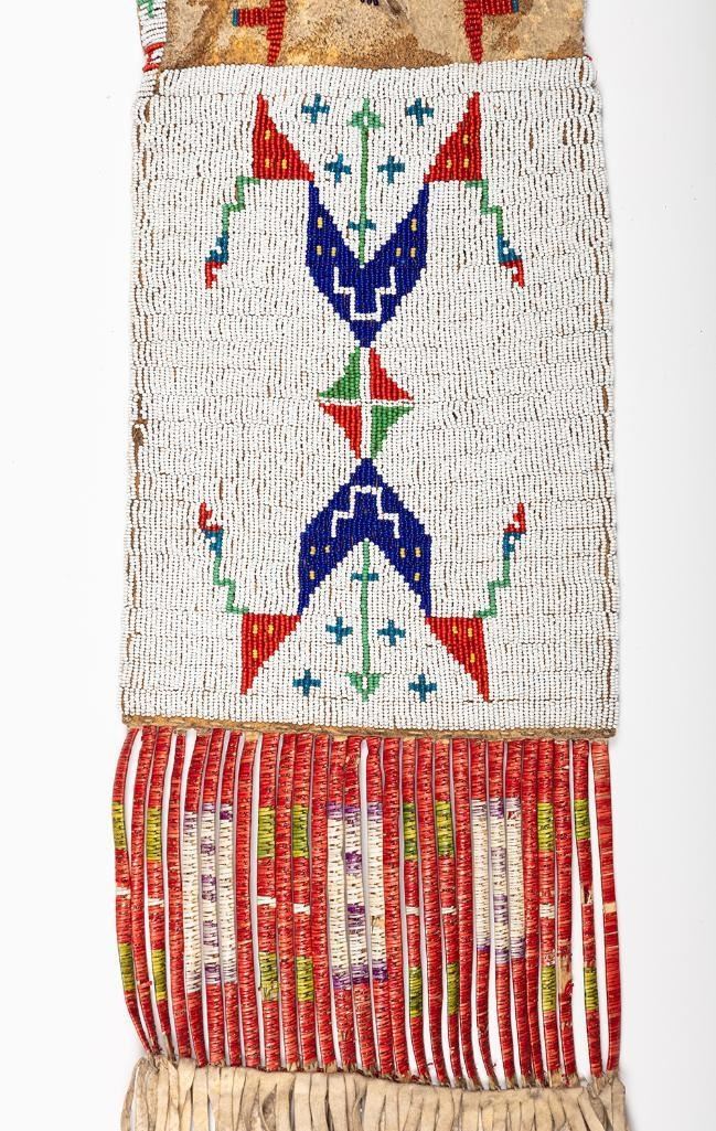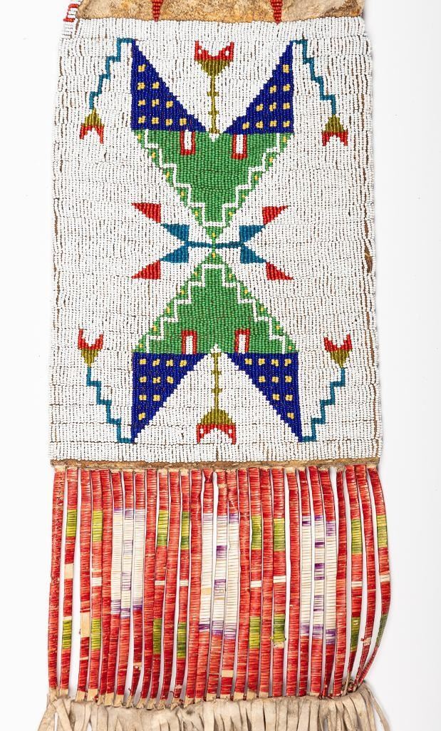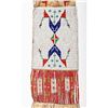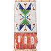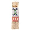 30" overall including 10" beaded panel with nice pictorial designs, 5.5" quilled panel and 8.5" of fringe. Beaded in geometric designs with bright beads. Very well done. 1910 vintage.