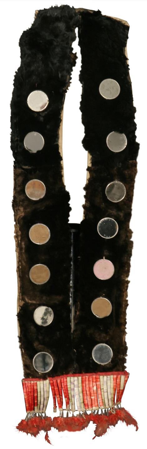 Sioux Beaver Hide Bandolier. 36" long, 9" wide. Quill drop with chicken feather and mirror decorations. 19th century. (est $900-1,200)