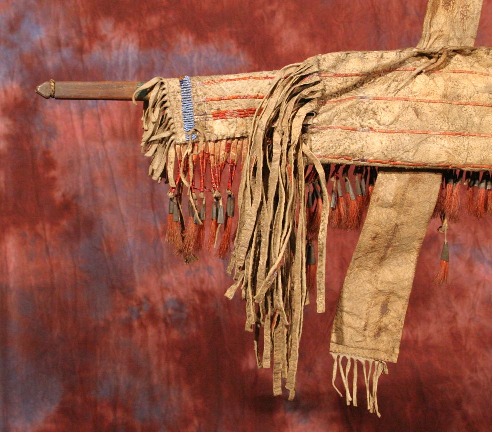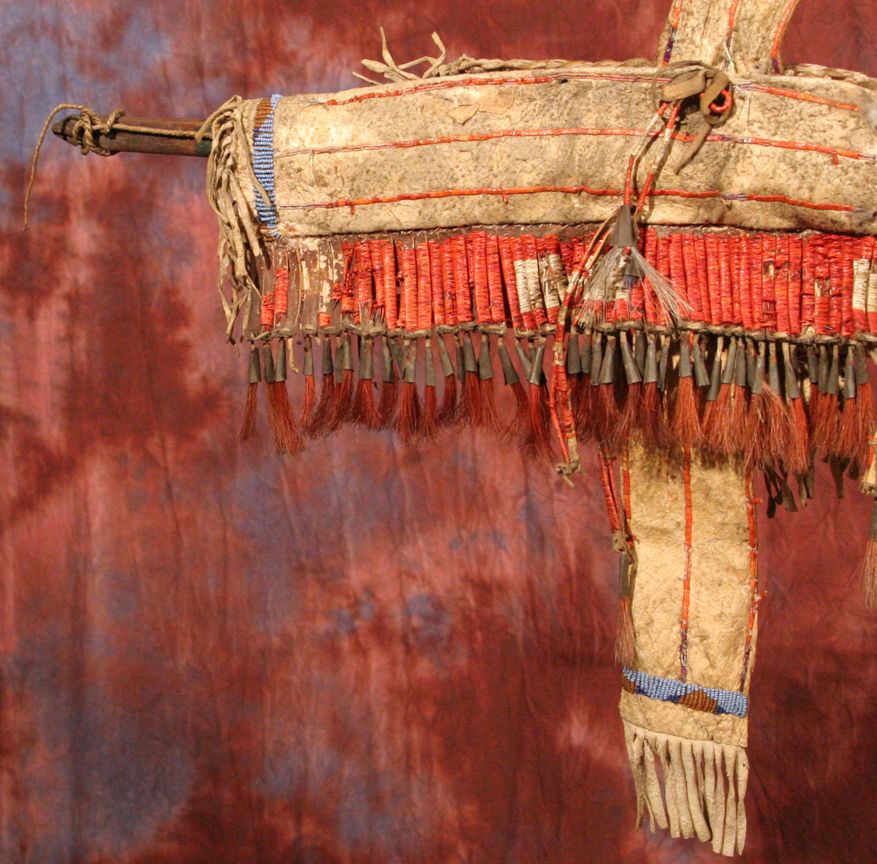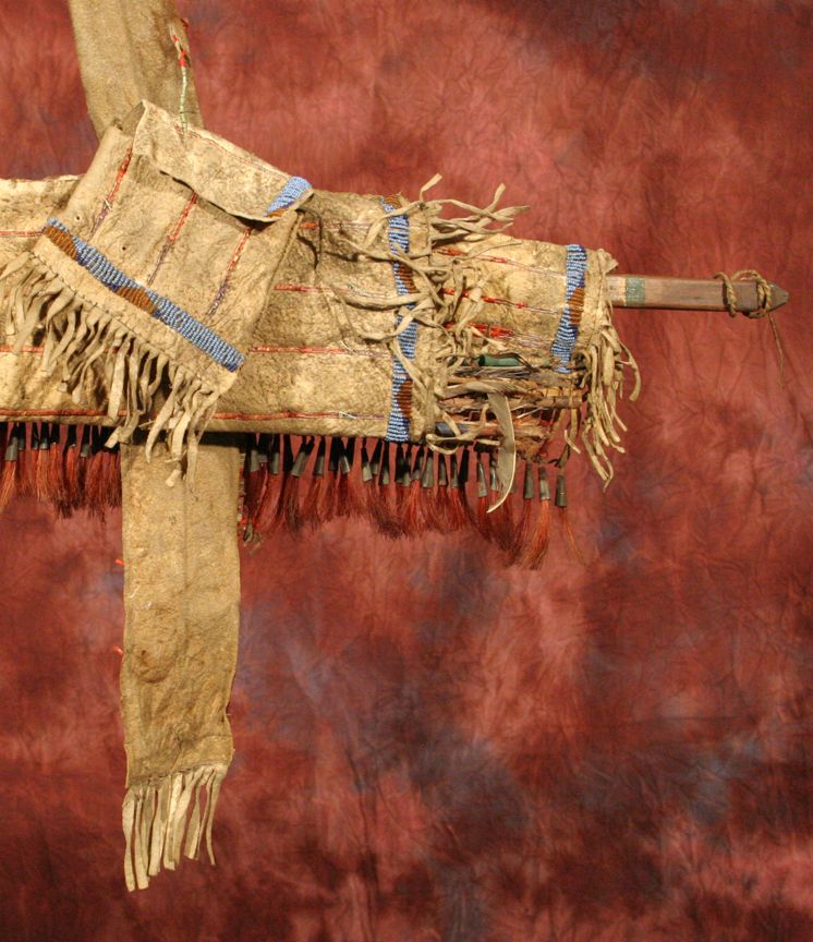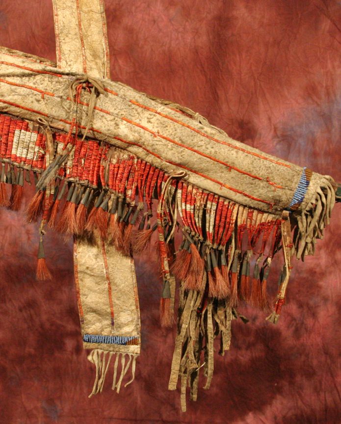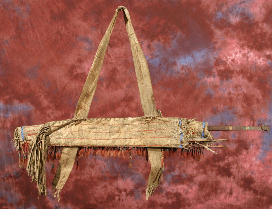Sioux Bowcase & Quiver. As shown on the front of the book Precious Dreams. Quiver is 24" x 5" with 9" of fringe, partially decorated with quillwork. Bowcase is 33" x 3" with 3" of fringe on both ends. 40" x 2" quilled strap. Belonged to Paints Brown, half brother of Sitting Bull. Reference: Stanley Vestal's book Sitting Bull, copyright 1932, published by Houghton Mifflin. Pages 29 & 31. Decorated with quillwork strips & beadwork on the ends. Terminating in horsehair filled tin cones. A magnificent piece of 19th century history. Includes four original arrows with metal heads & a painted bow. A 4 ½" x 4 ½" quilled bag is attached. Circa 1870s. Provenance: Ex-Raymond Vietzen collection, (Founder of Ohio Archeology Society in 1940s, Elyria, OH). Collection of Dr. Delwin & Karen Bokelman, PA., & pictured in their book Precious Dreams, pages 24, 34 & covers. Condition reports can be viewed at www.marchinmontana.com/docs/2013CR.pdf