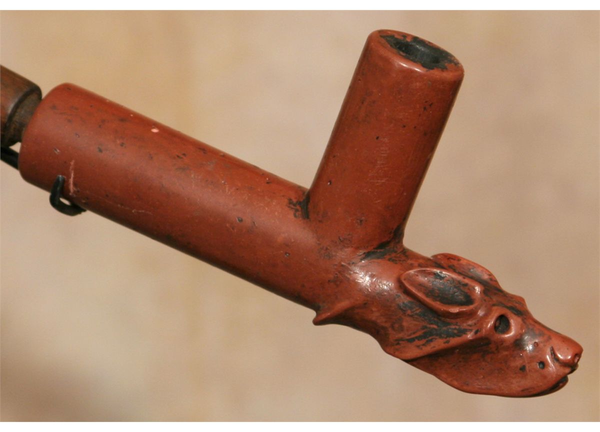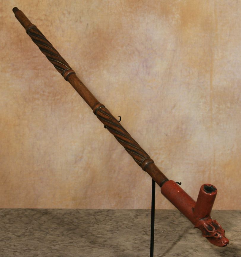 Sioux Calumet Figural Pipe & Stem. 7" x 3.5" carved catlinite dog's head effigy bowl. 25" carved wooden stem. Circa 1880s. Condition reports can be viewed at www.marchinmontana.com/docs/2013CR.pdf