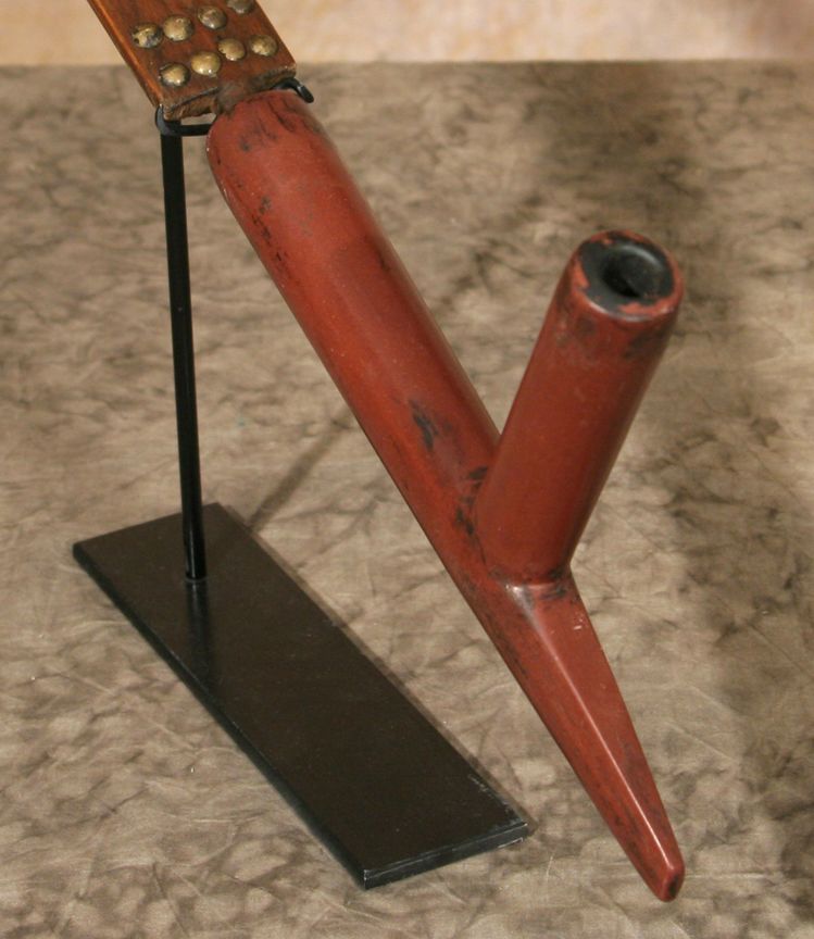 Sioux Calumet Pipe & Stem. 9.75" x 5.5" catlinite bowl with tapering prow. 31" wooden stem, finely decorated with braided quillwork, ribbons, trade cloth, horsehair & tacks. Circa 1870s-80s. Condition reports can be viewed at www.marchinmontana.com/docs/2013CR.pdf