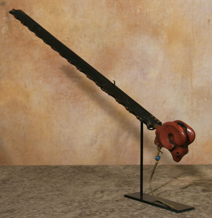 Sioux Calumet Figural Pipe & Stem. 4" x 4" carved catlinite ram's head effigy bowl with hide tassel. 28" file burned & tacked wooden stem. Circa 1870s-80s. Condition reports can be viewed at www.marchinmontana.com/docs/2013CR.pdf