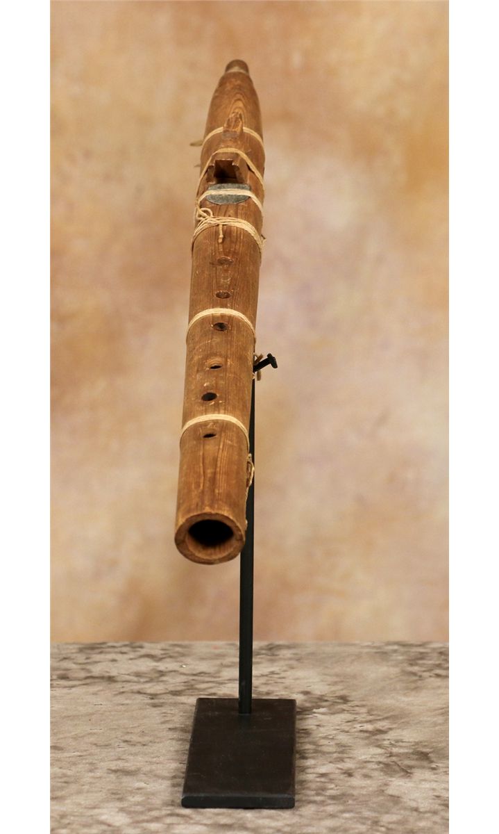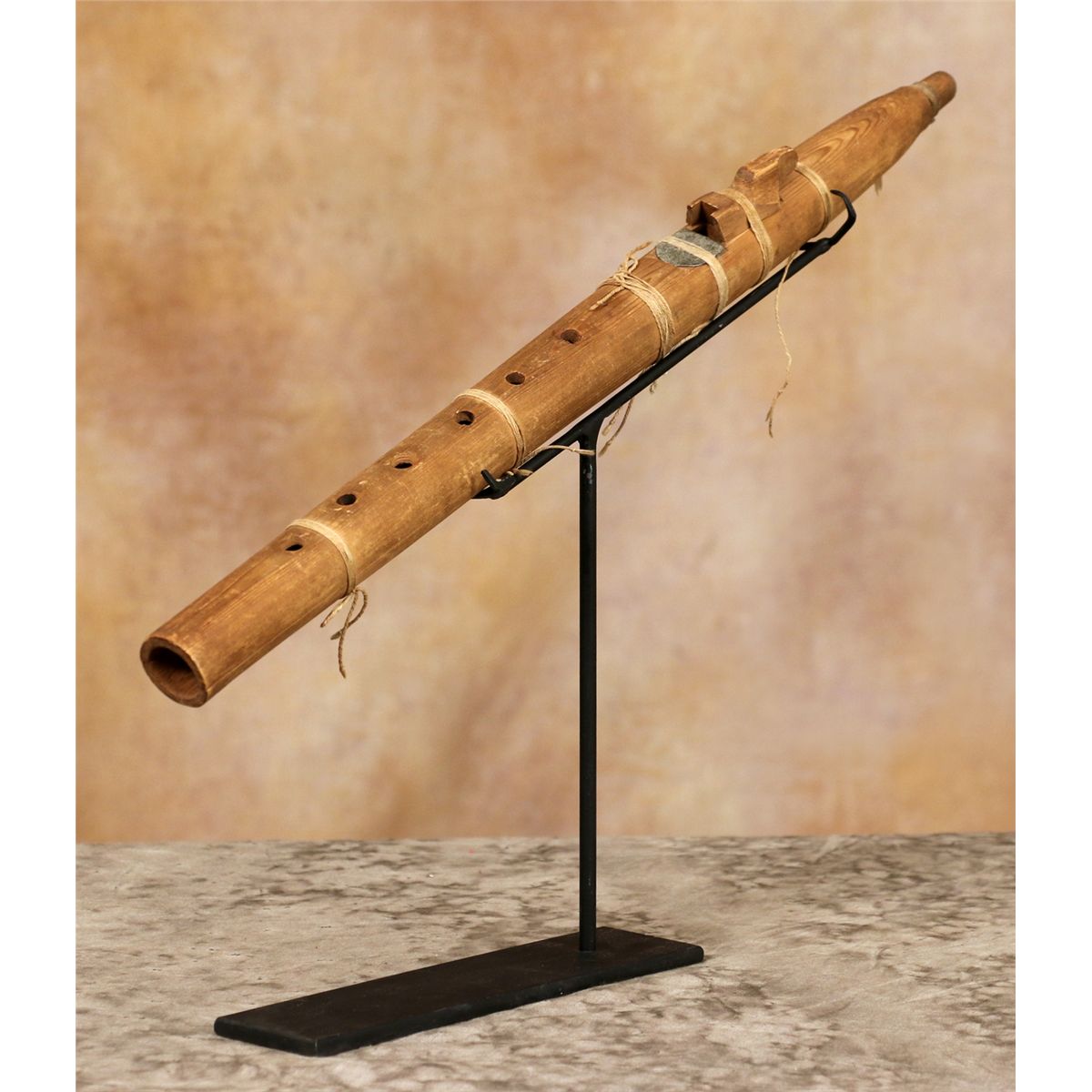 Sioux Courting Flute. 18.25" long. Carved from soft wood. Figural flue cover. Still plays. 19th century.