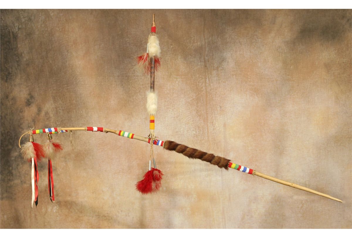 Sioux Dog Eater Fork & Spoon. 42" & 16" wood utensils decorated with beadwork, fur, ribbons, tin cones, feathers, thimbles & hide. Rare set. Circa 1930s. Condition reports can be viewed at www.marchinmontana.com/docs/2013CR.pdf