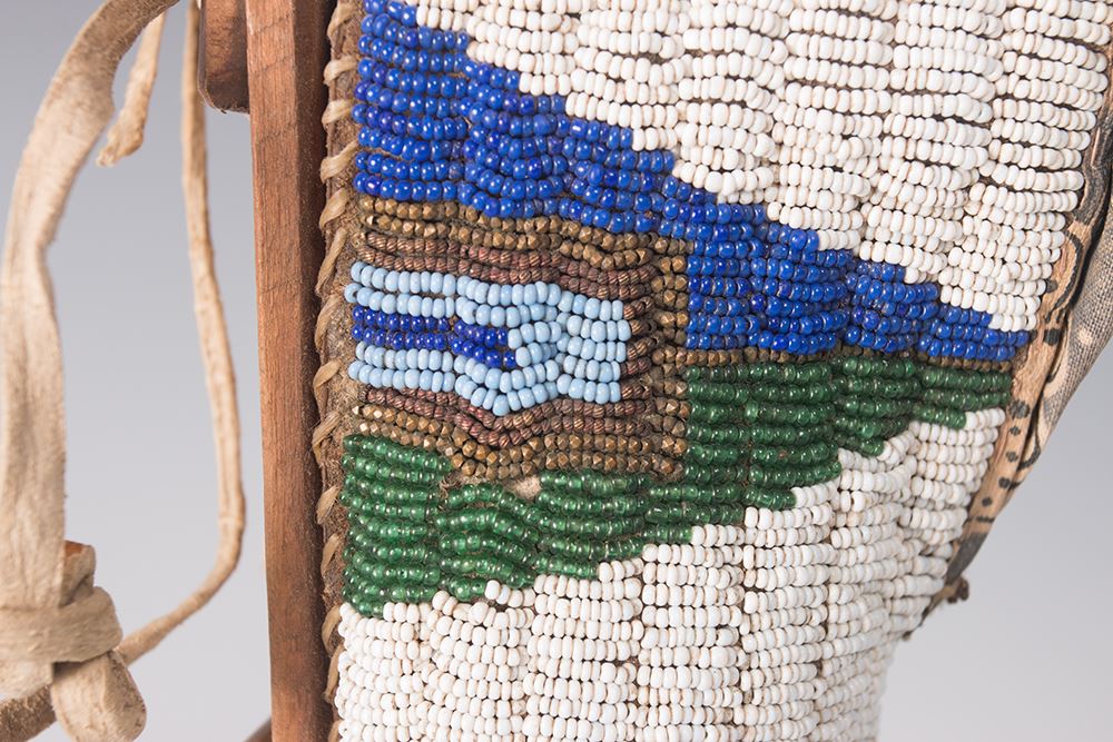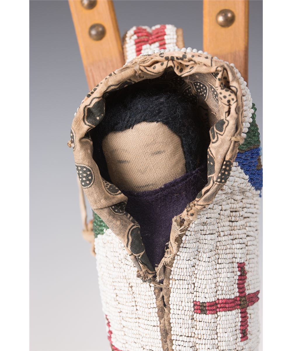 Sioux Doll Cradle. 13" tall. Fully beaded in cross and teepee designs, utilizing a combination of solid, translucent and metal beads. Fabric lined. With newer tacked sticks and a cloth doll. Beaded cradle is 1870s. With custom stand.