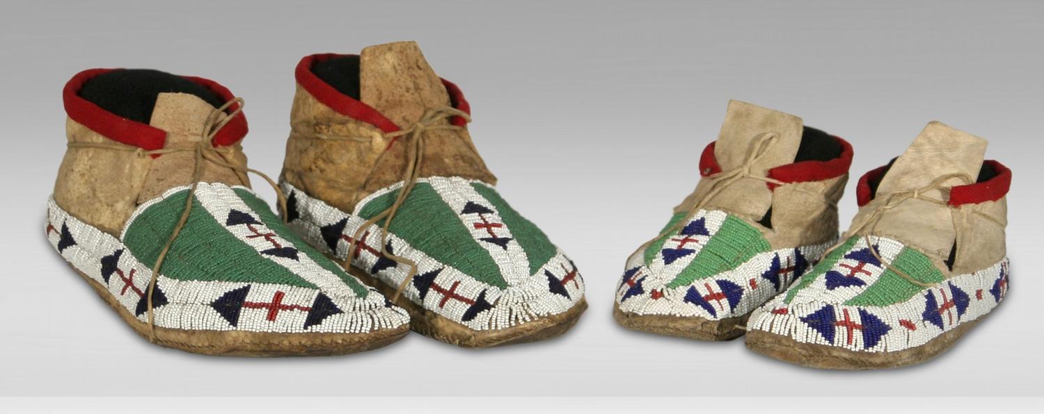 Sioux Father & Son Beaded Moccasins. Father: 10 ½", Son: 7". 19th century. (est $3,000-4,000) Condition Report: Some discoloration to hide from wear and age. Beadwork excellent on both