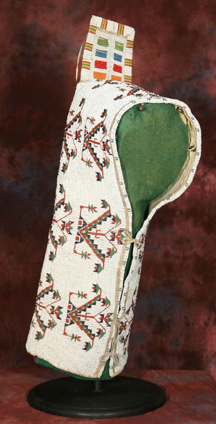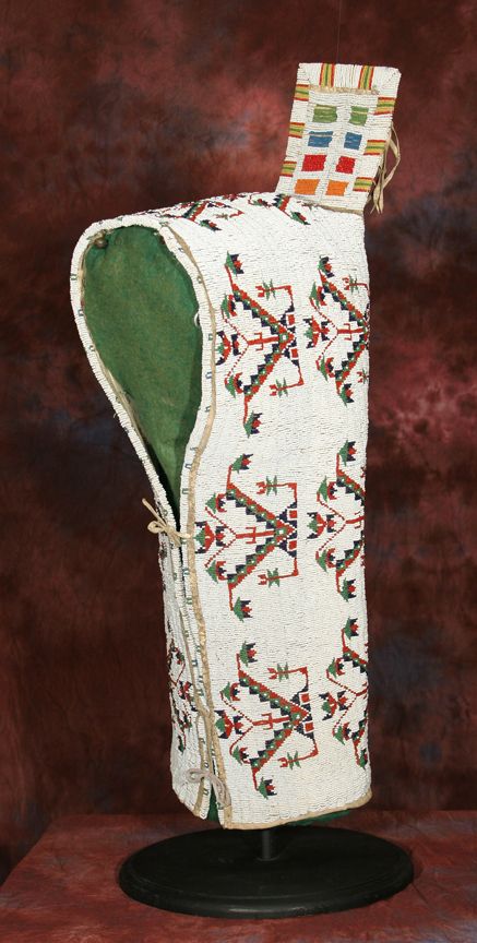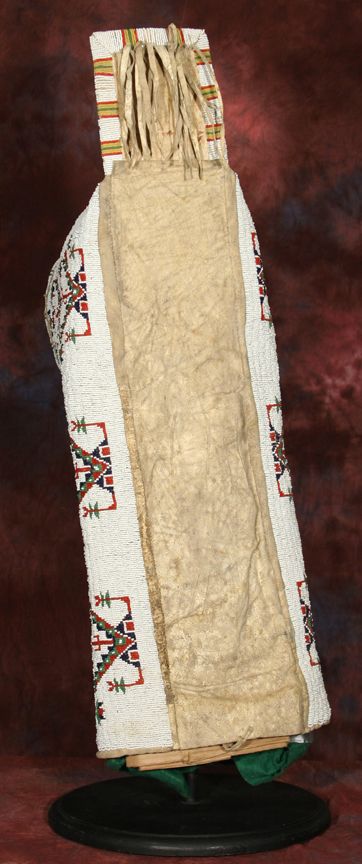 Sioux Cradle. 32" x 11". Intricate fully beaded designs in classic colors on Indian tanned hide. Circa 1890-1900. Provenance: Collection of Dr. Delwin & Karen Bokelman, PA., & pictured in their book Precious Dreams, page 11. Condition reports can be viewed at www.marchinmontana.com/docs/2013CR.pdf