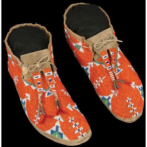 Sioux Man's Moccasins, 11" long, Beautiful colors with typical designs. Double tongue with tin cones, c. 1910, Excellent condition except for one missing cone and some missing horsehair in tassles