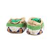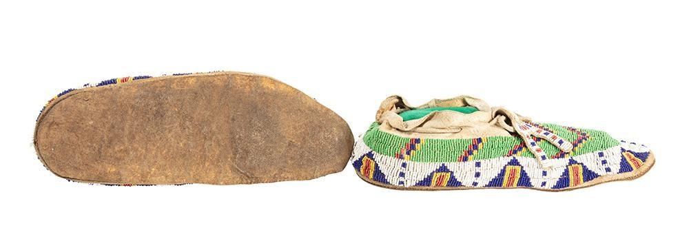 10.75" with geometric beaded designs in green, blue, yellow, white and white-heart red beads. Split beaded tongues, ties and parfleche soles. 19th century.