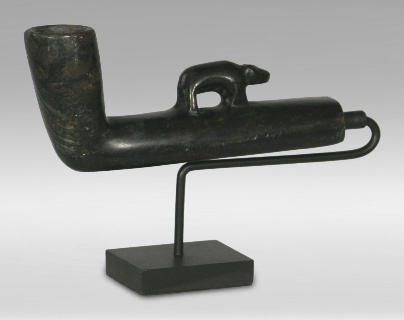 Sioux Pipe Bowl. Carved Bear Designs. Bowl measures 6 ½" x 3". On custom base. 19th century. (est $2,500-3,000) Condition Report: Nice patina from age. Some small scratches, but generally excellent