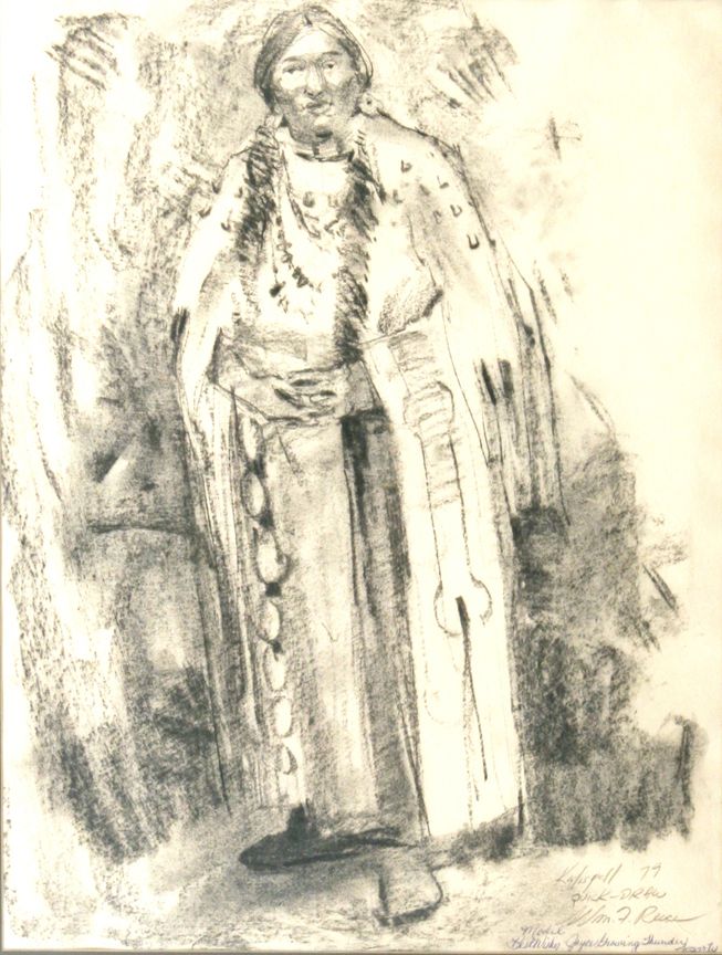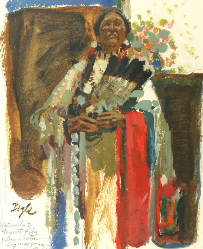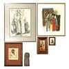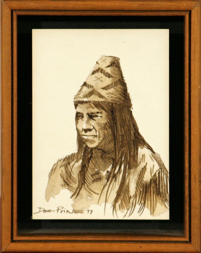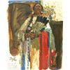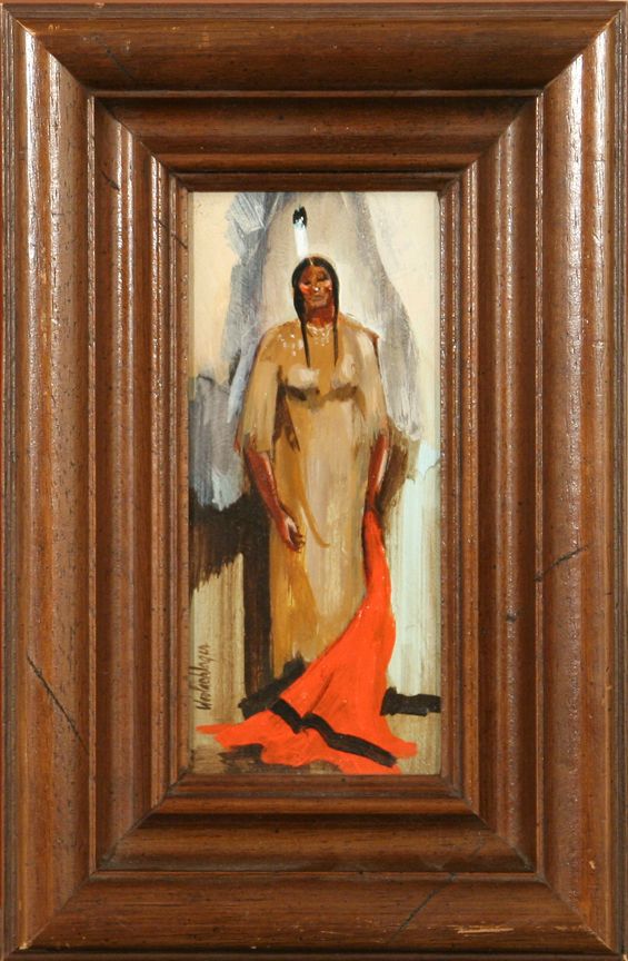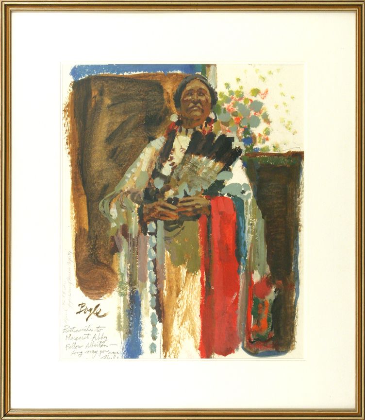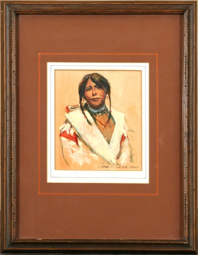 Thomas Lorimer (1941 - ). Navajo Man. 7" x 6" oil on board. Signed lower right: Thomas W. Lorimer - 79 [fish]. William Reese (1938 - 2010). Joyce Growing Thunder Fogarty. 21" x 16" charcoal. Signed lower right: Wm F. Reese. With inscriptions from the artist & model. Quick Draw winner. Neil Boyle (1931 - 2006). Joyce Growing Thunder Fogarty. 17.25" x 14.5" mixed media. Signed lower left: Boyle. With inscriptions from the artist & model. Laura Woolschlager (1932 - ). Trade Blanket. 6.75" x 3.25" acrylic on board. Signed lower left: Woolschlager. Doug Prine (20th century). Native Man. 4.75" x 3.5" watercolor. Signed lower left: Doug Prine '77. With ink caricature of a cowboy verso. Nicolai Fechin (1881 - 1955). Old Man. 10.5" x 4.5" x 5" bronze. Inscribed: © Paul Masa 30/35. Condition reports can be viewed at www.marchinmontana.com/docs/2013CR.pdf