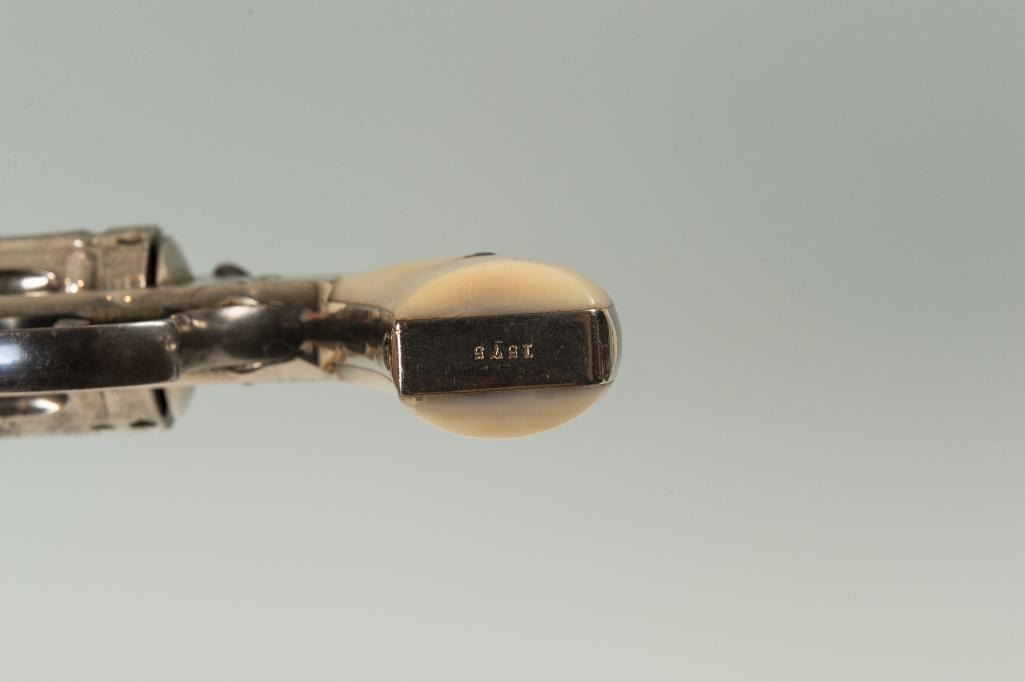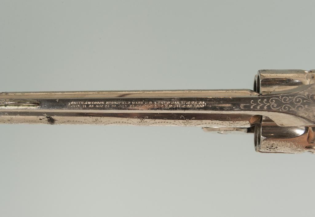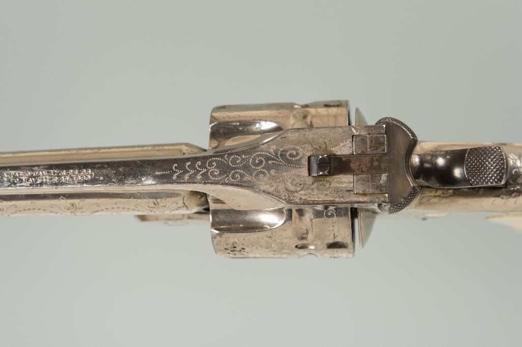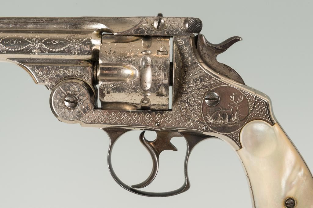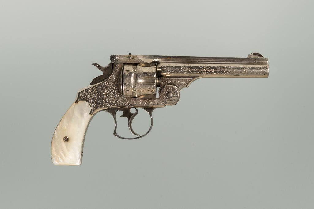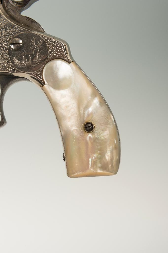 Smith Wesson 44 DA. Engraved in Merwin Hulbert style. Highly unusual. Fine pearl grips. $2,000-3,000
