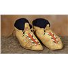 Southern Cheyenne Moccasins. 11" long men's beaded moccasins. Beaded on yellow and red ochred hide with 5" heel fringe trailers. Circa 1890.