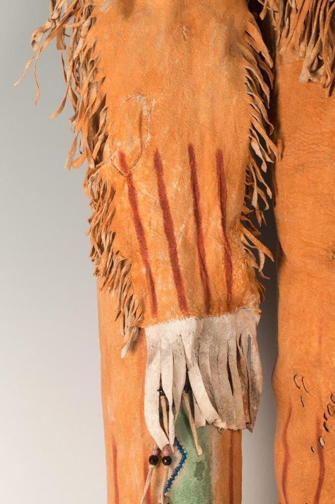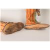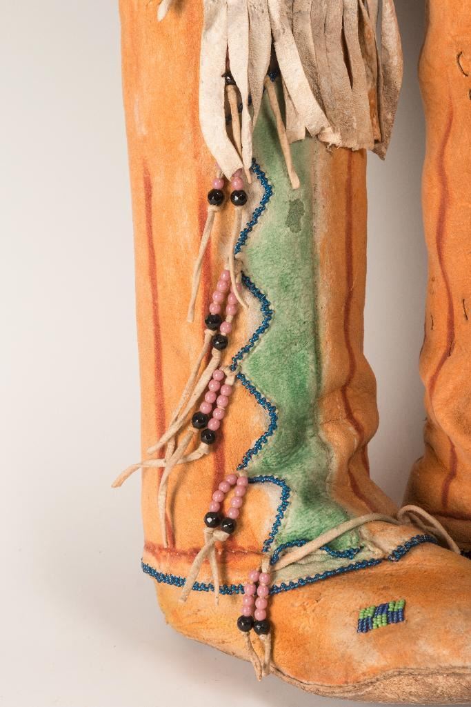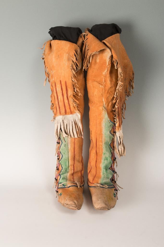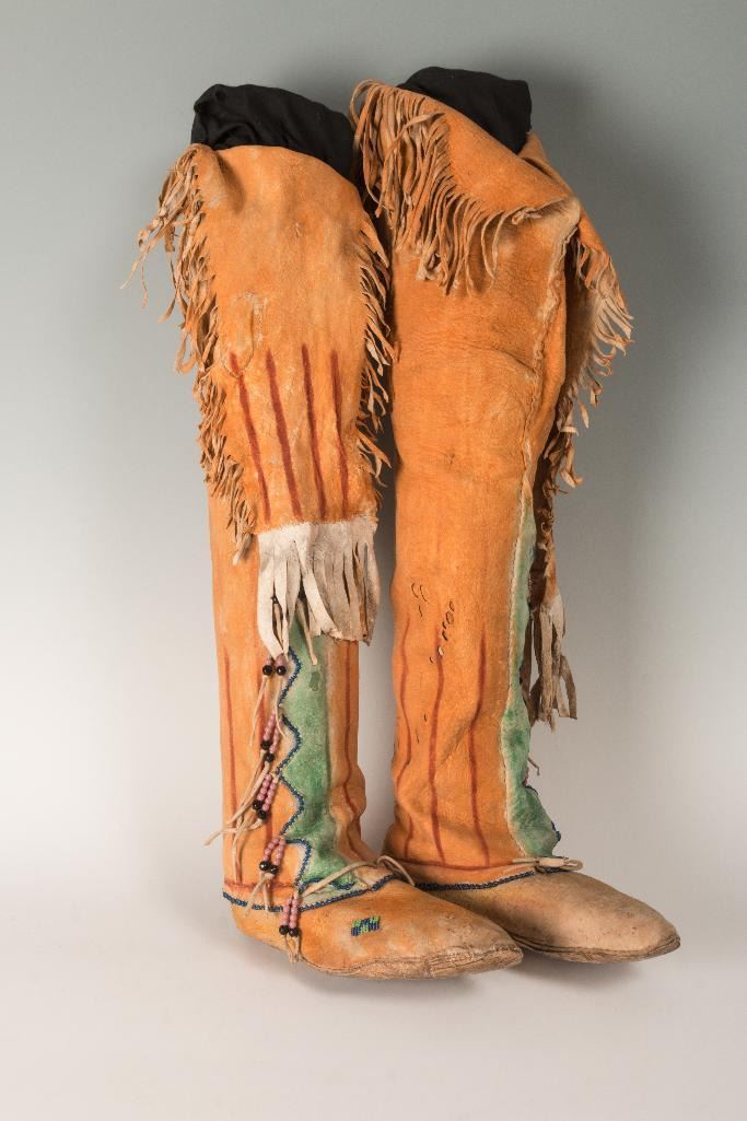 Southern Plains Beaded Woman's Hightop Moccasins 8.5" long, 21" tall. Accented with trade beaded drops on orange, green and red ochre. Circa 1910. $3,500-4,500