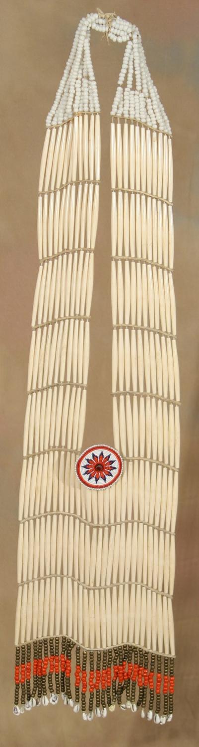 Southern Plains Woman's Breastplate. 45" x 11". bone hair pipes, trade beads, cowrie shells and a beaded rosette. all original stringing. circa early 1900's. (est $1,500-2,500). Provenance: Ex Blackpipe Museum collection, Martin, SD. Condition Report: Hairpipes are excellent and a nice, light color. Trade beads and medallian excellent