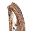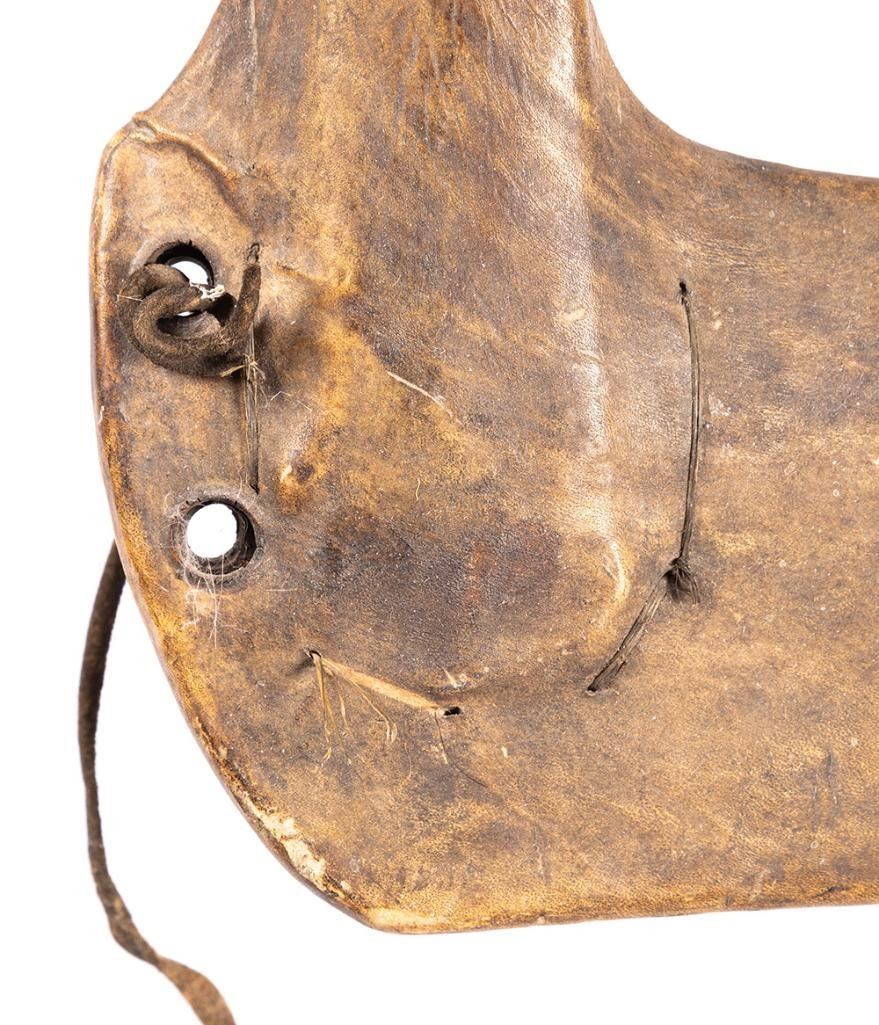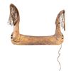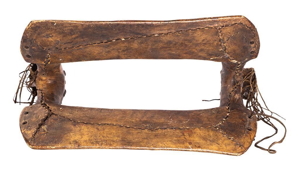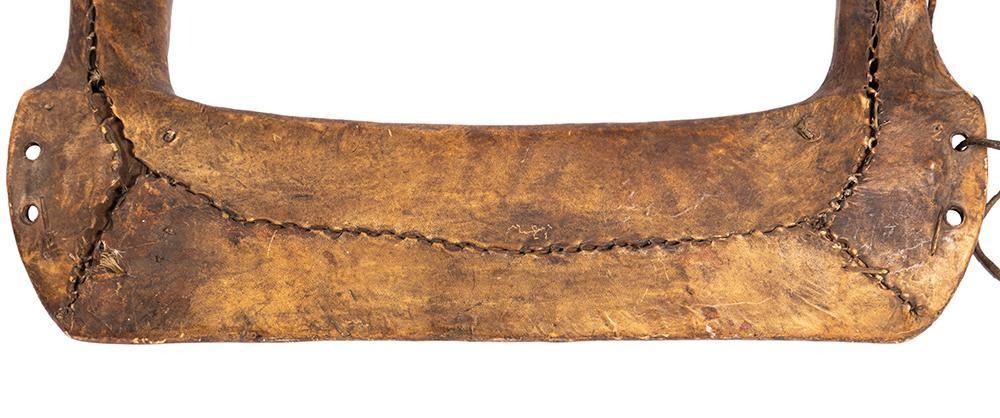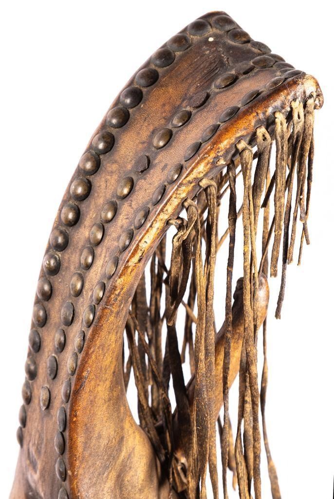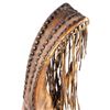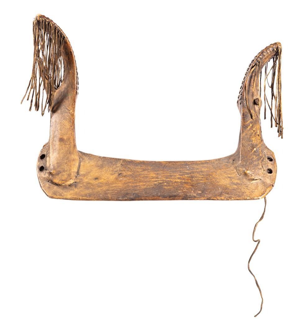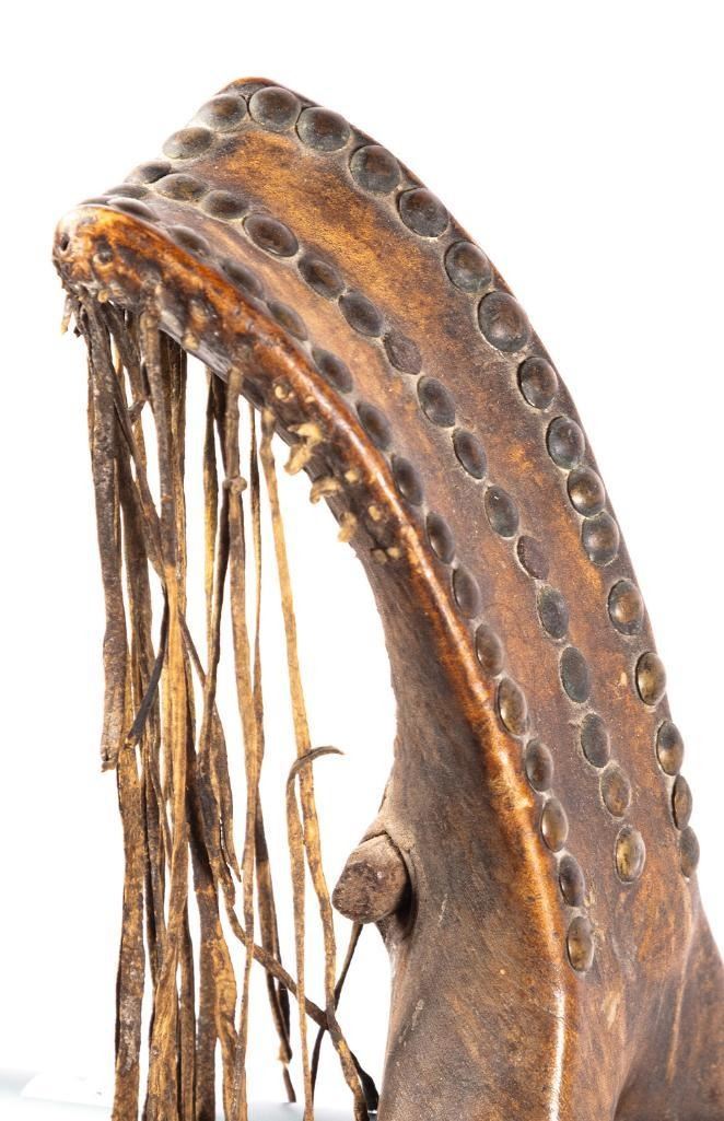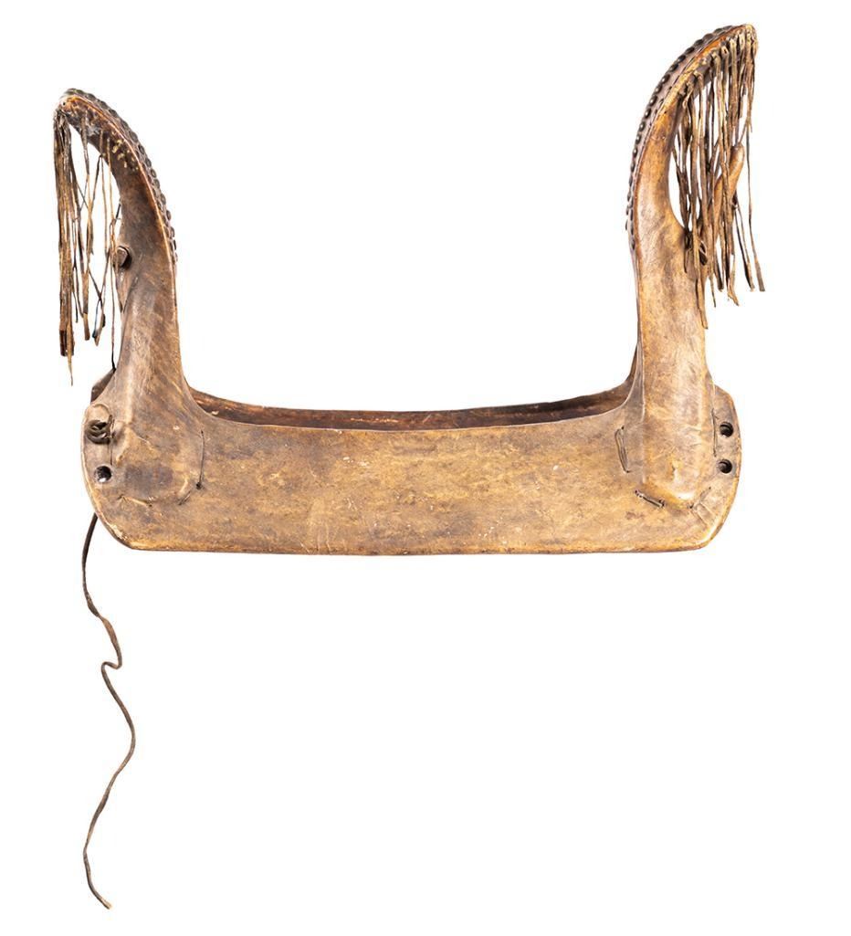 12" seat. Wooden tree frame covered with rawhide. Pommel and horn are decorated with brass tacks and fringe. Late 19th century.